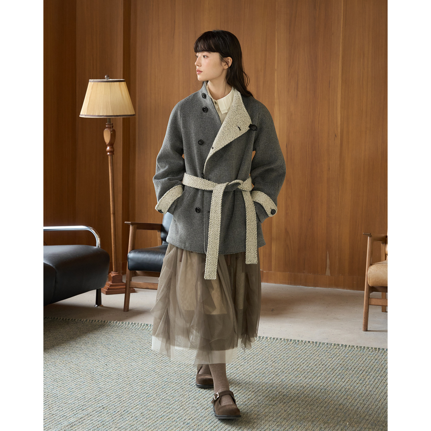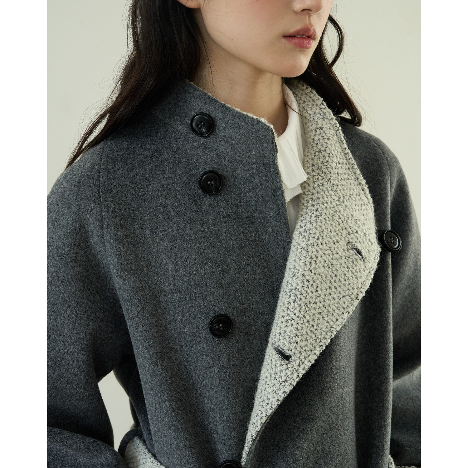 aww 多种穿法·撞色系带立领呢子外套灰色大衣女秋冬可调节腰带