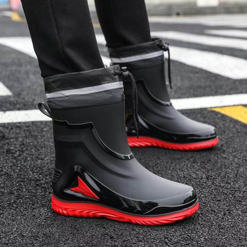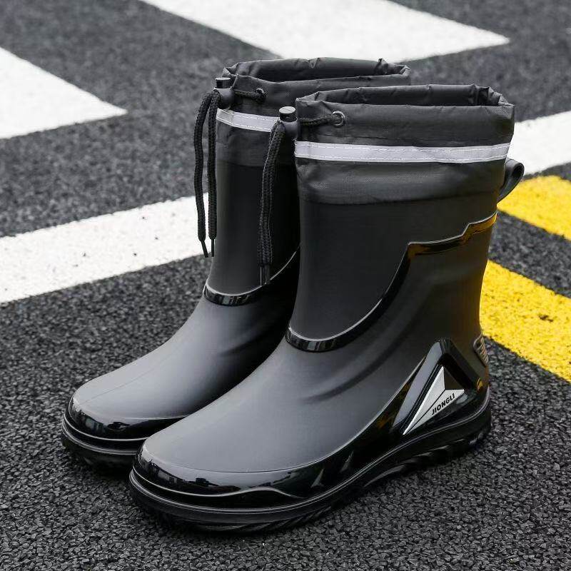 工地钓鱼洗车水靴 牛筋底耐磨中筒雨靴加绒劳保胶鞋 雨鞋 男高筒水鞋