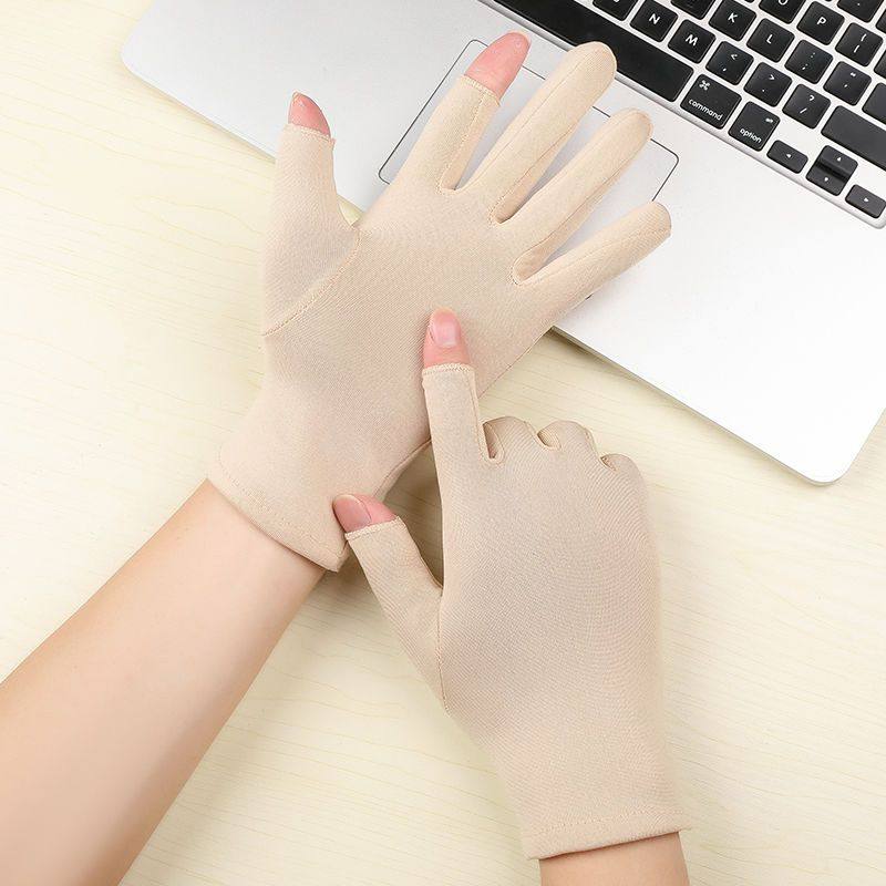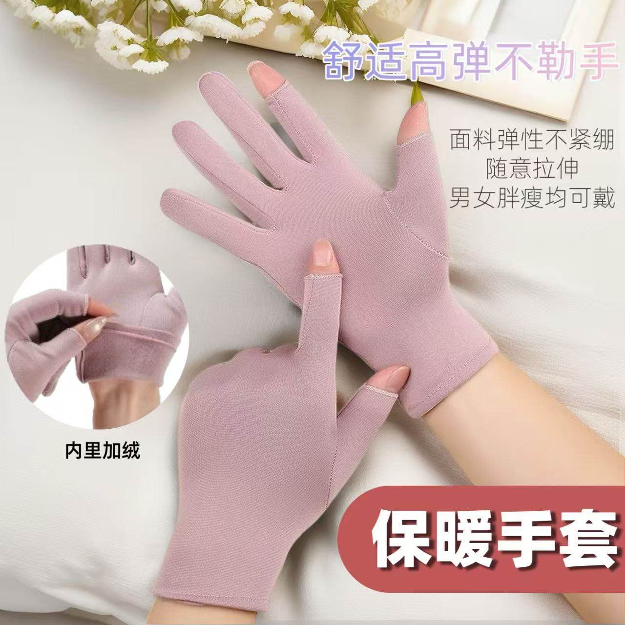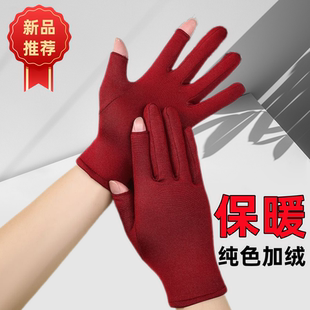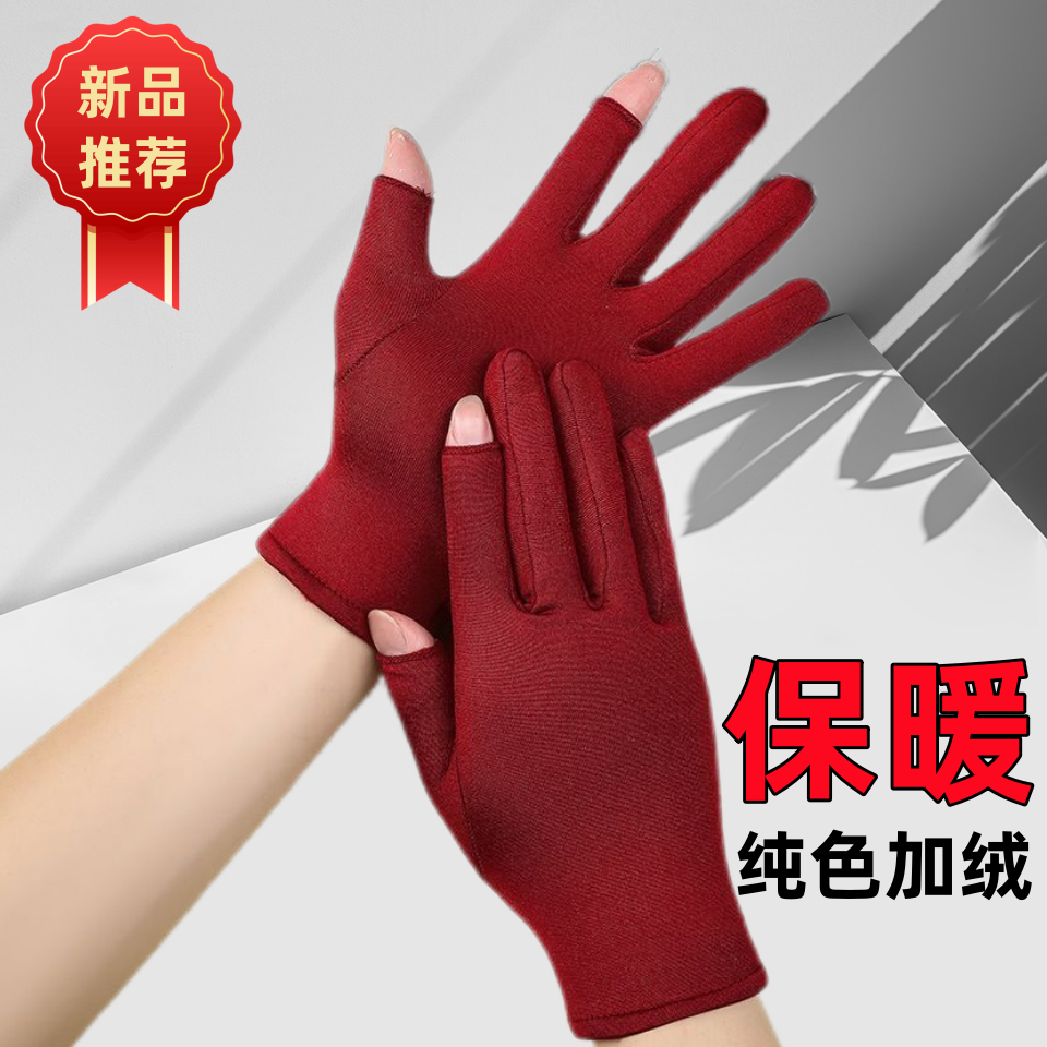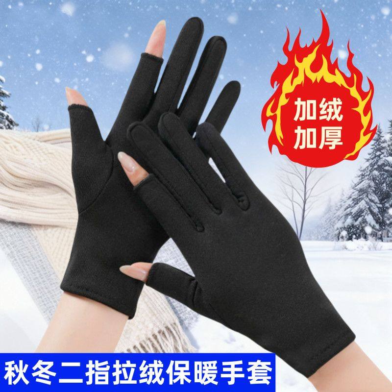 冬季 防寒加绒保暖加厚工作开车骑行跳舞弹力 纯色露二指手套薄绒款