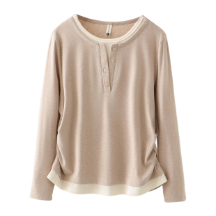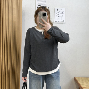 宛宛大码 针织t恤女假两件正肩体恤胖MM遮肉显瘦上衣 休闲复古长袖