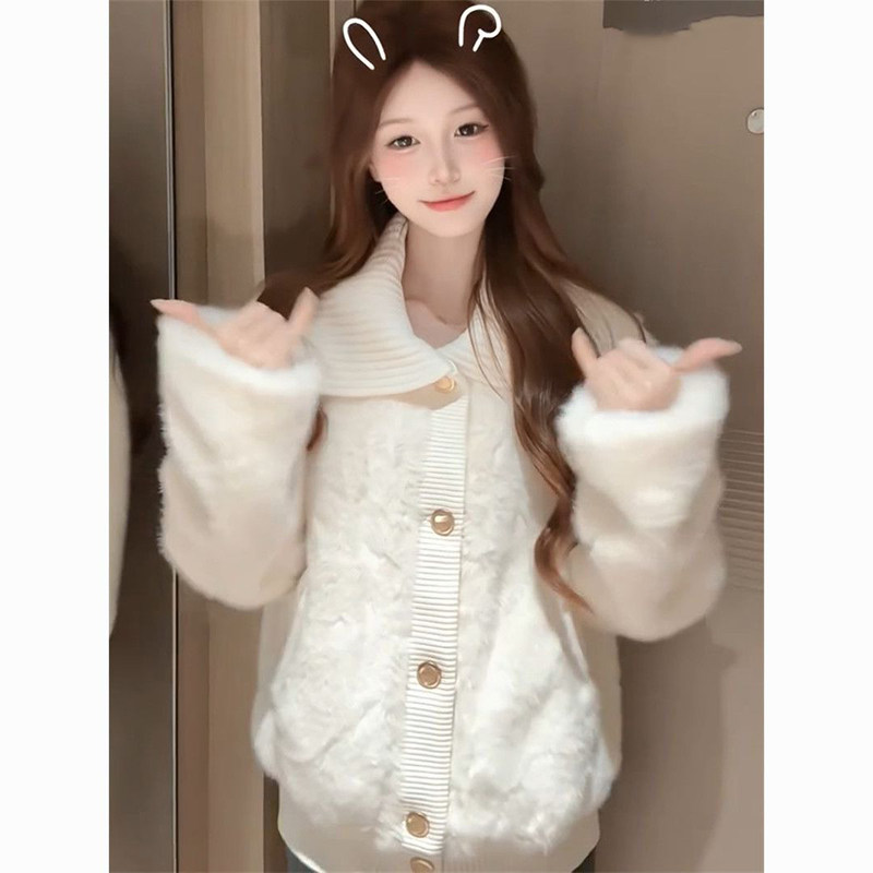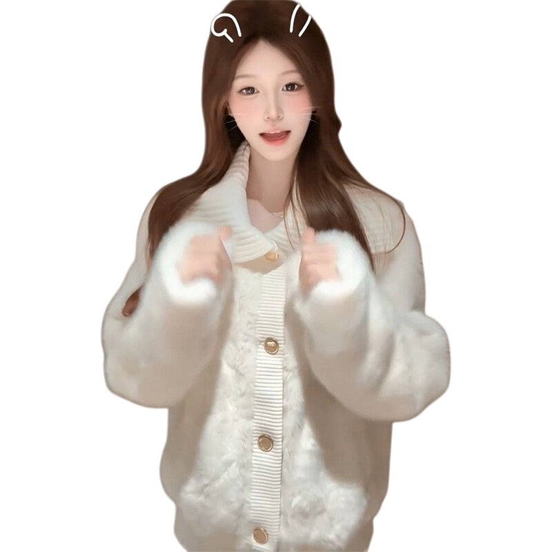 法式 秋冬排扣小众宽松保暖上衣外套 温柔甜美风米白色翻领毛衣开衫