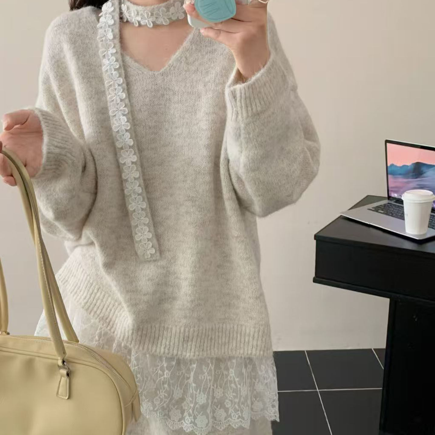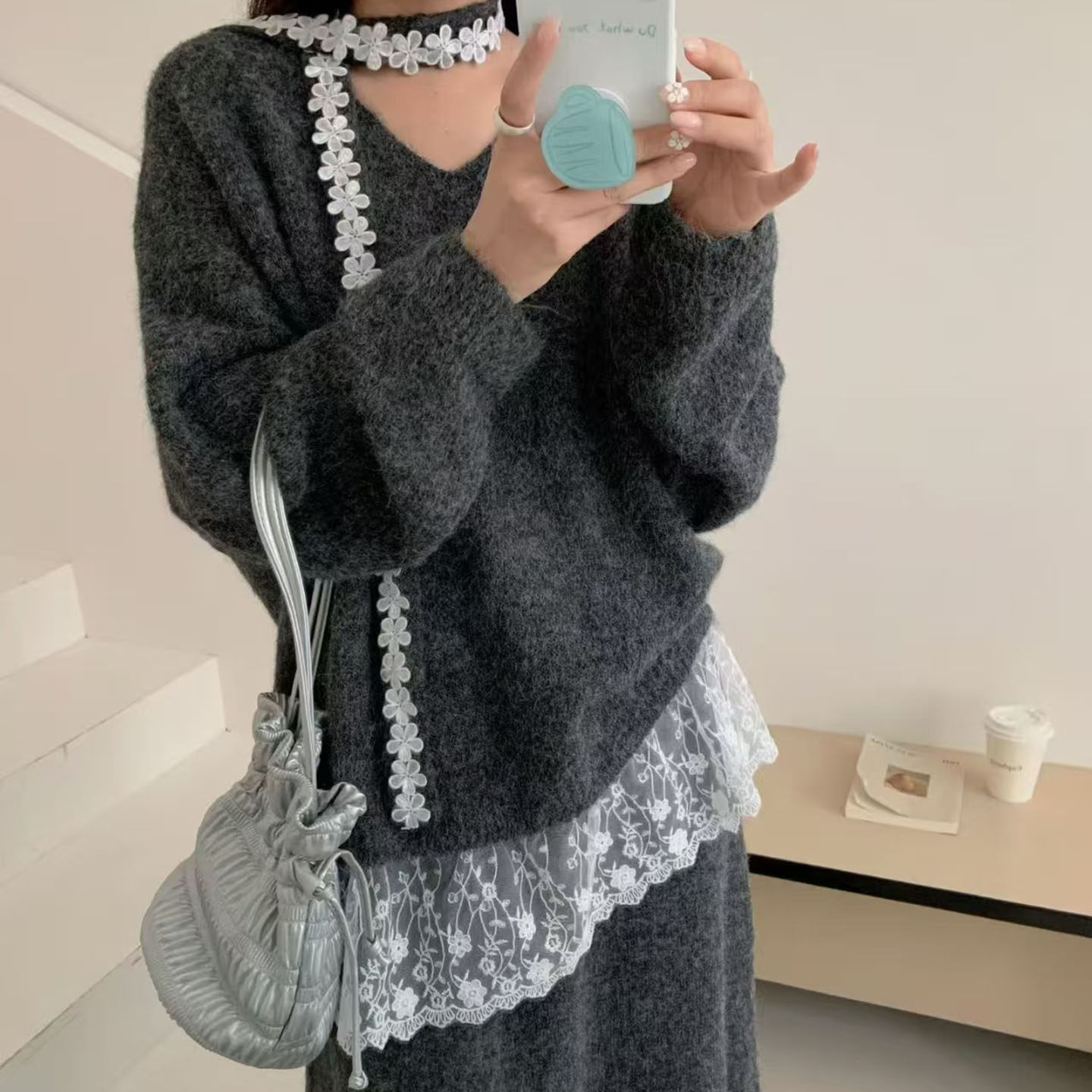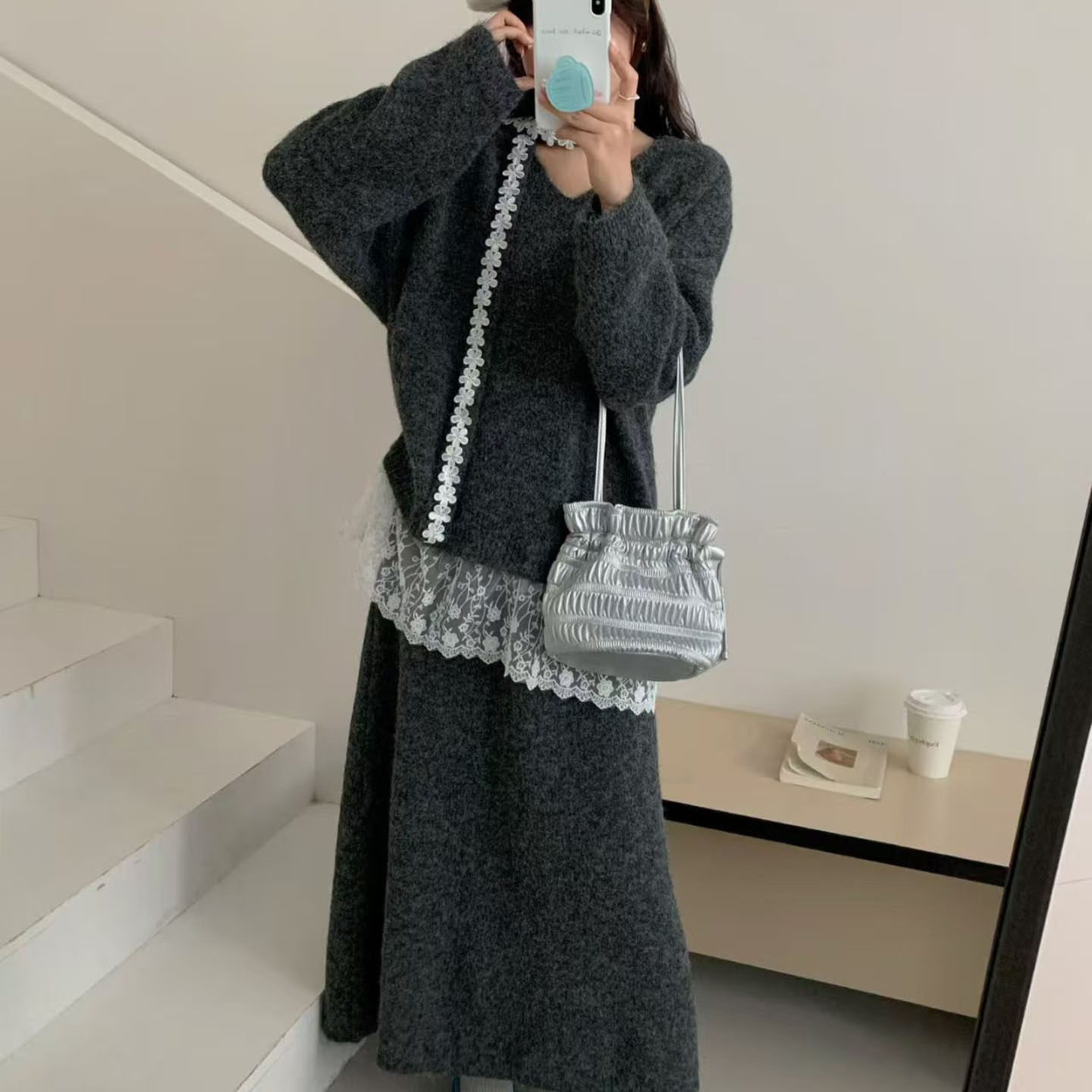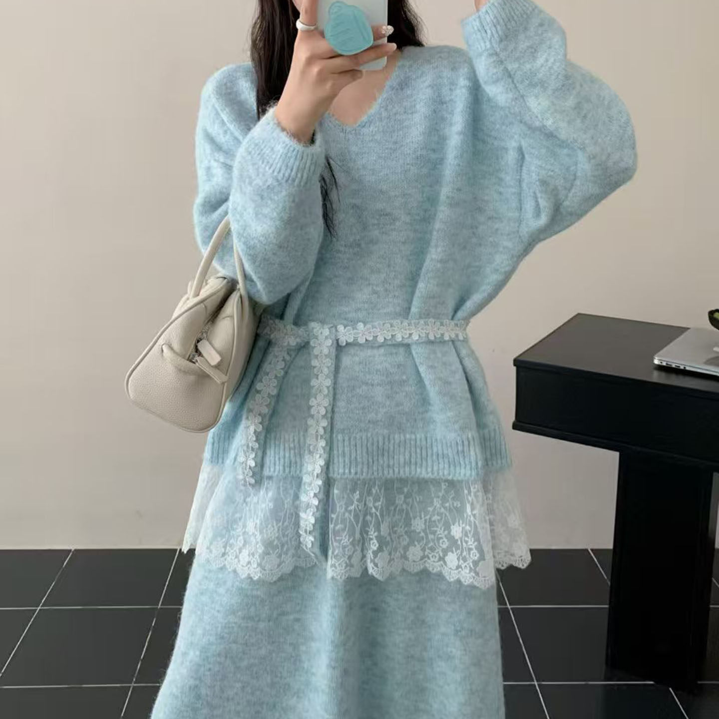 胖mm遮肉两件套 半身长裙女秋冬新款 飘带蕾丝连衣裙套装 拼接毛衣