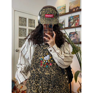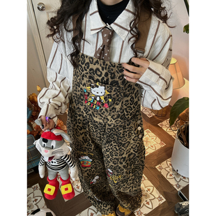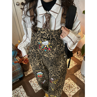 秋 宽松甜美百搭显瘦休闲裤 森女部落黑色小猫刺绣背带裤 女2025新款