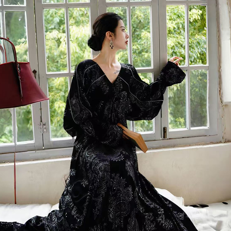 玄黑重磅金钻绒烫钻显瘦百搭连衣裙 新中式 澄渔高定 锦麟观黛