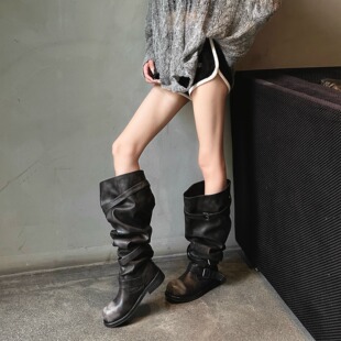 小众设计大筒围过膝长靴女2026春夏新款 褶皱堆堆靴圆头高筒骑士靴