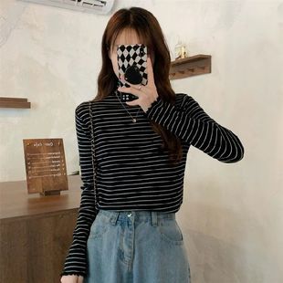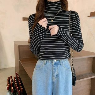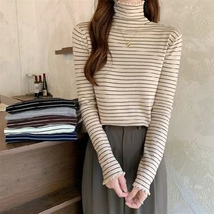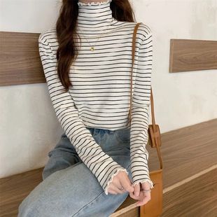 螺纹德绒条纹半高领长袖 女内搭木耳边加绒保暖上衣秋冬 T恤打底衫