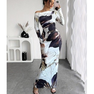 包臀长袖 秋季 性感斜肩印花修身 欧美风时尚 连衣裙长裙女DRESS 新款