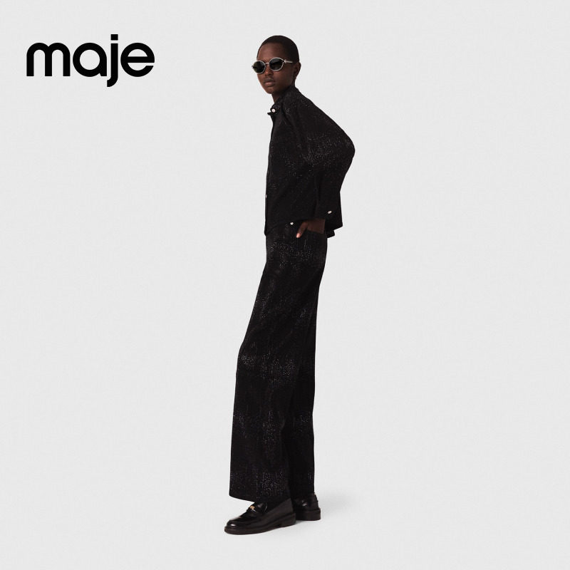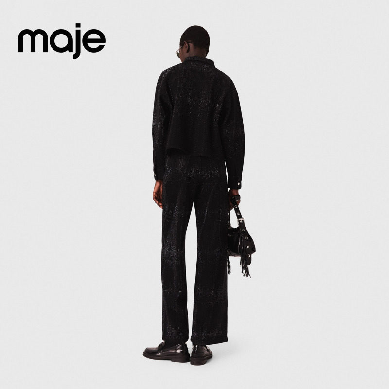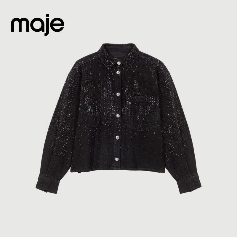 时尚 棉质黑色翻领仿钻装 饰长袖 Maje2025秋冬款 衬衫 法式 短款 女装