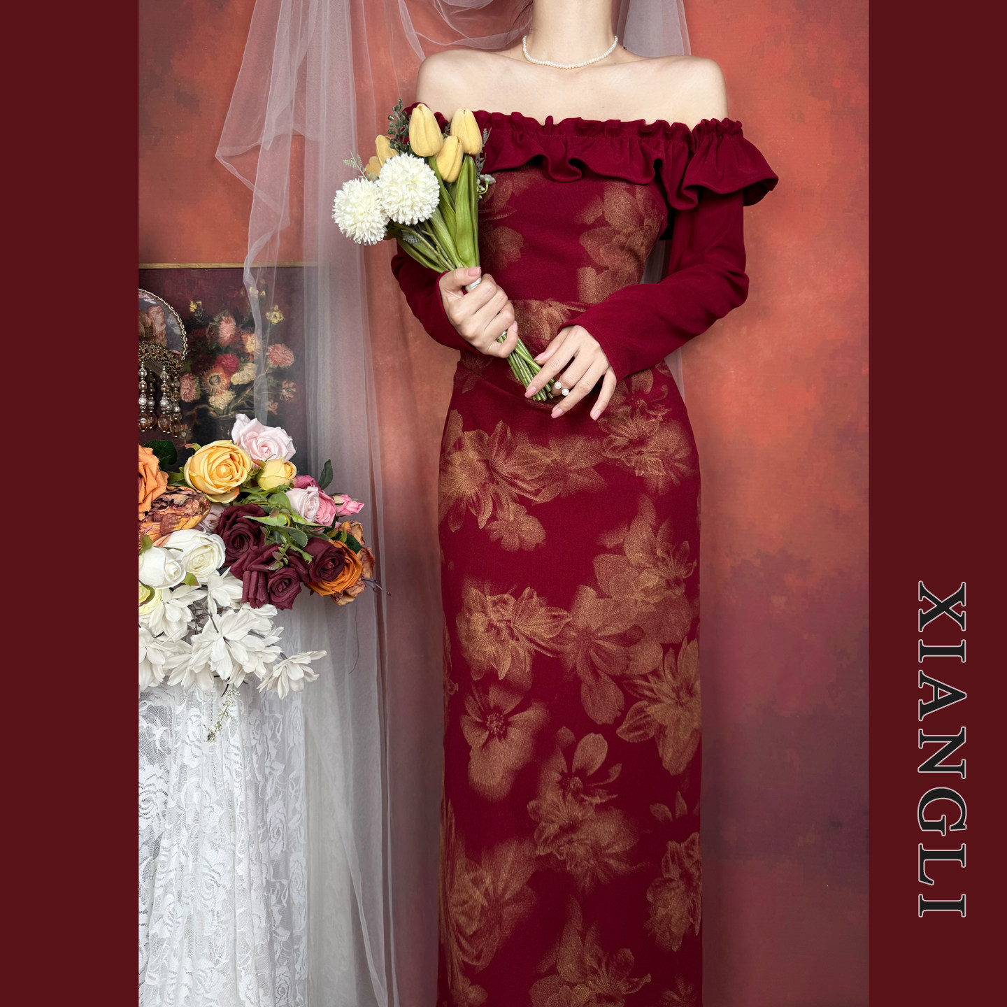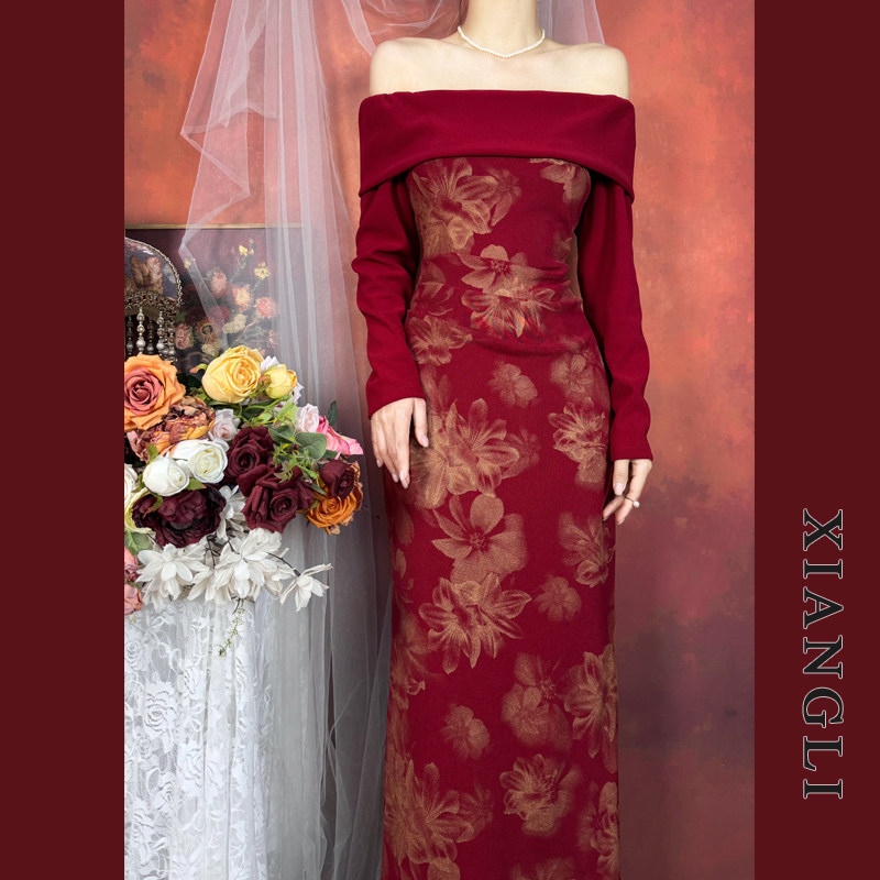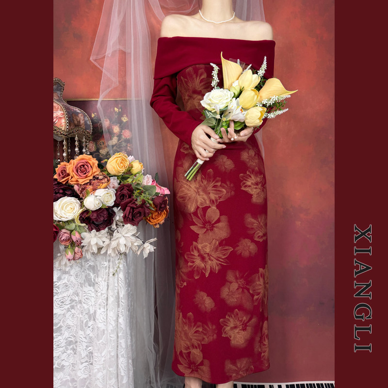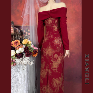 巷里法式 气质显瘦订婚敬酒礼服裙 复古一字肩红色连衣裙女秋冬长袖