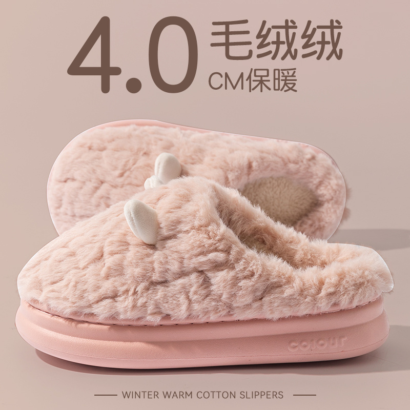 室内家居用厚底踩屎感棉拖 2025新款 蝴蝶结毛毛绒棉拖鞋 女士秋冬季