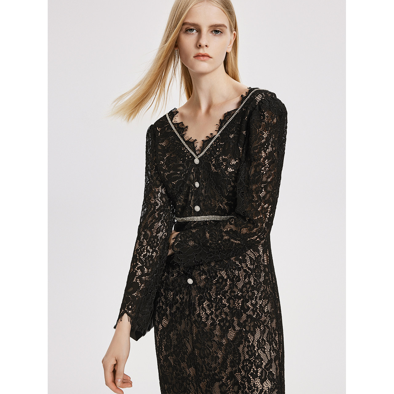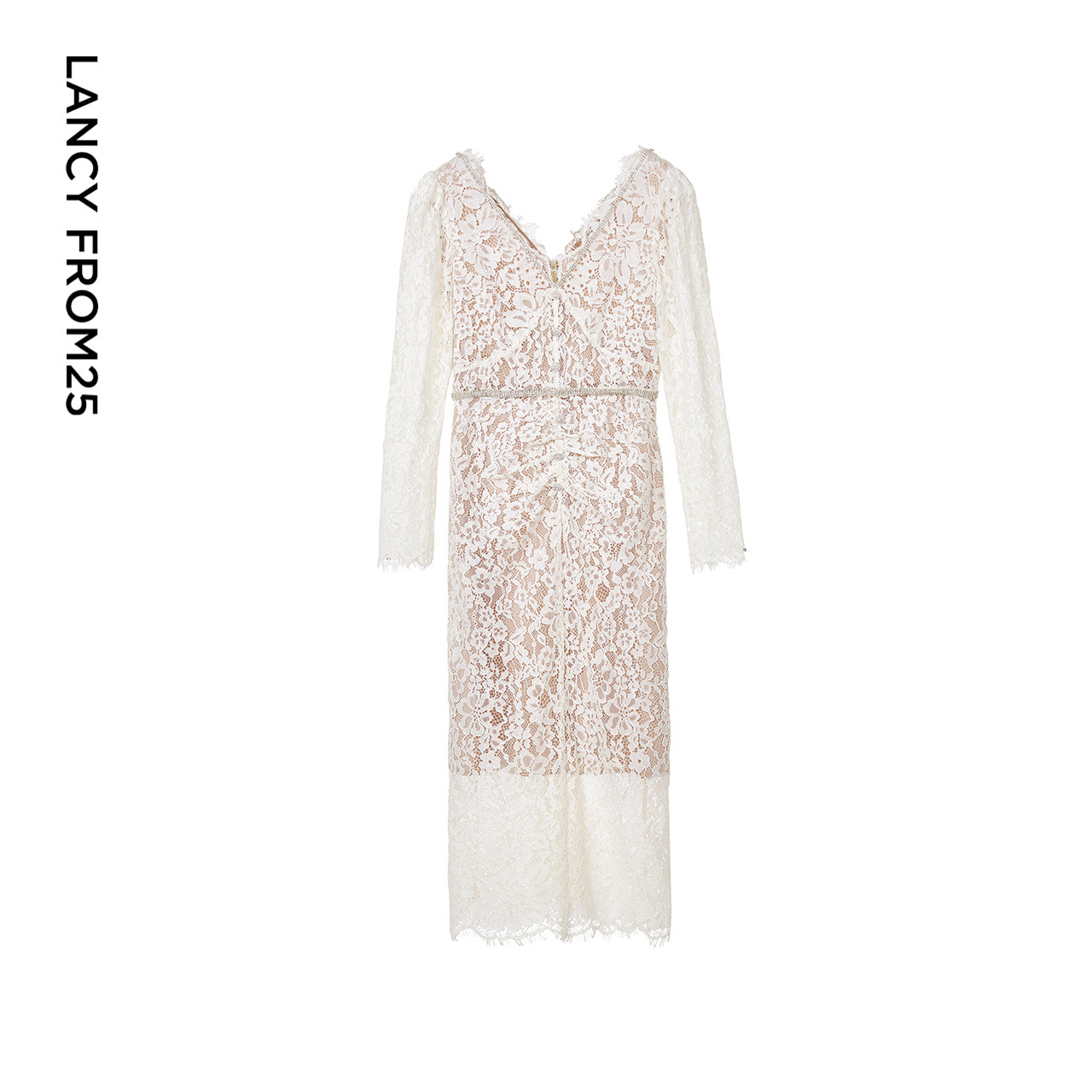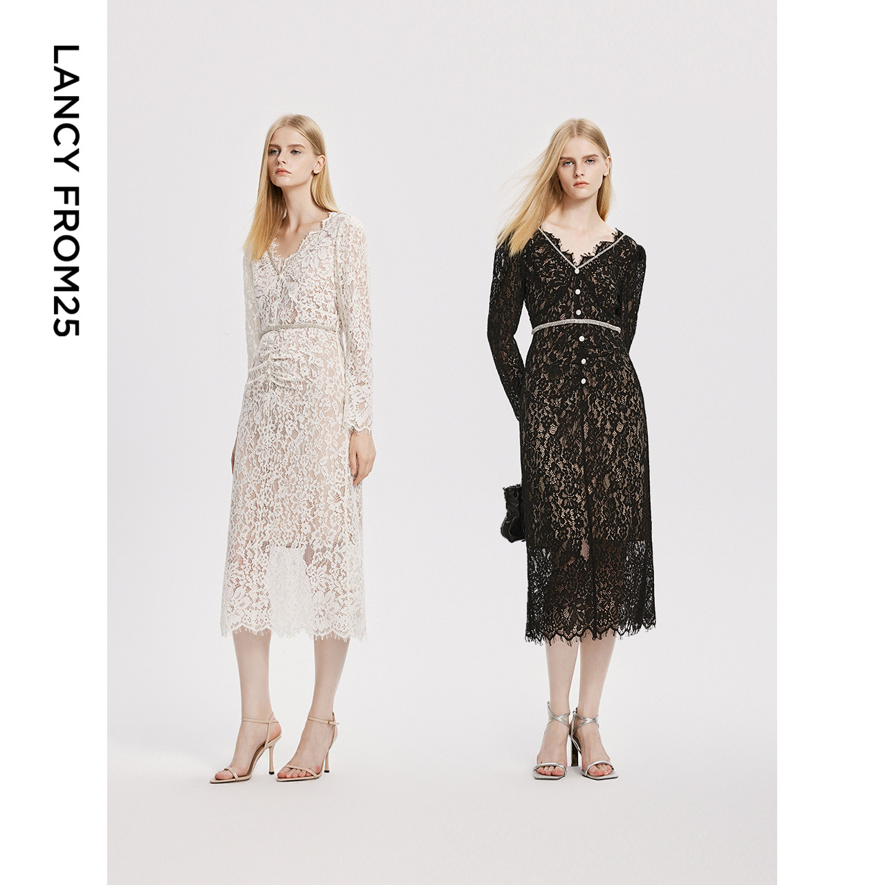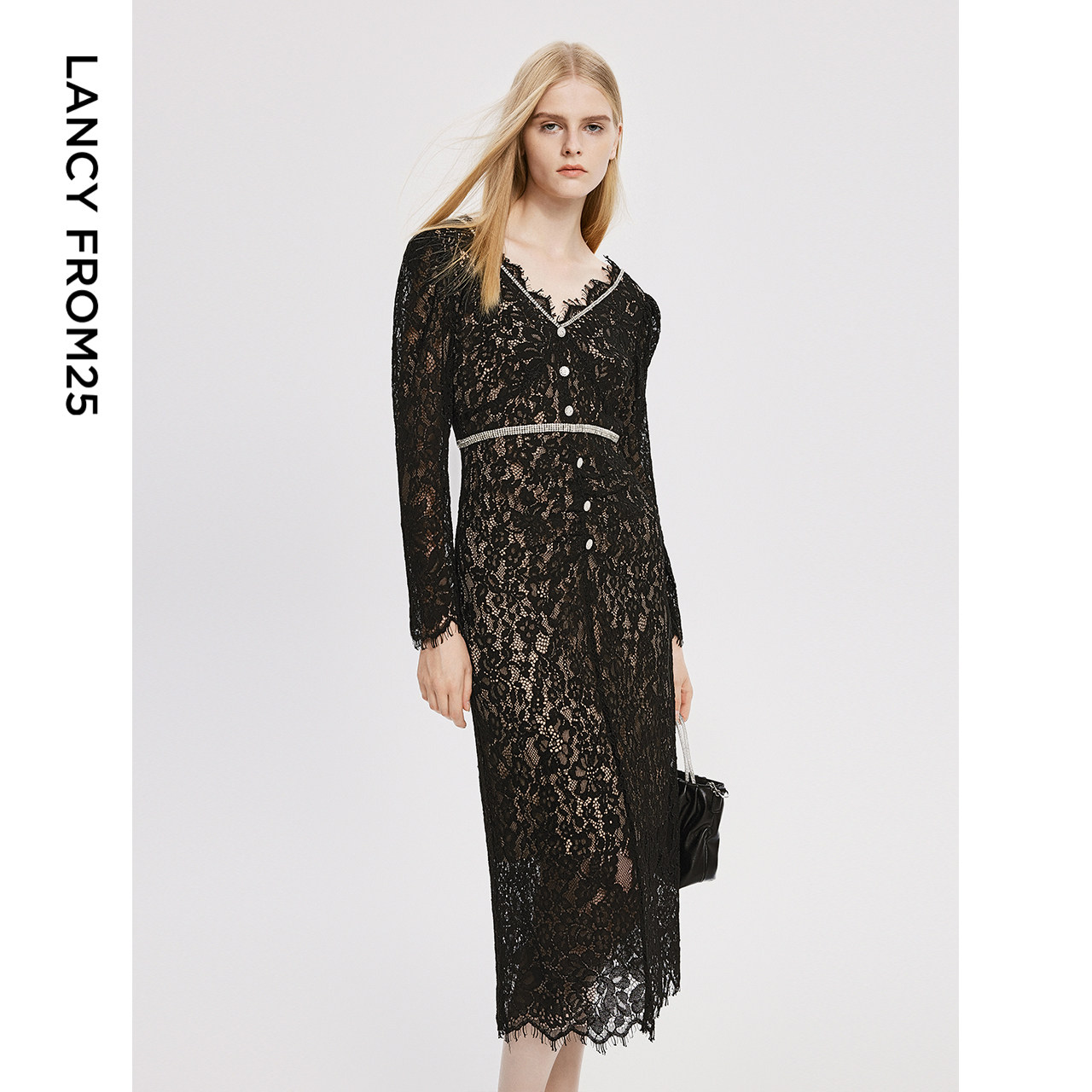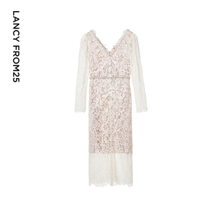 朗姿法式 收腰显瘦连衣裙女礼服裙 蕾丝v领气质高级感裙子春秋新款