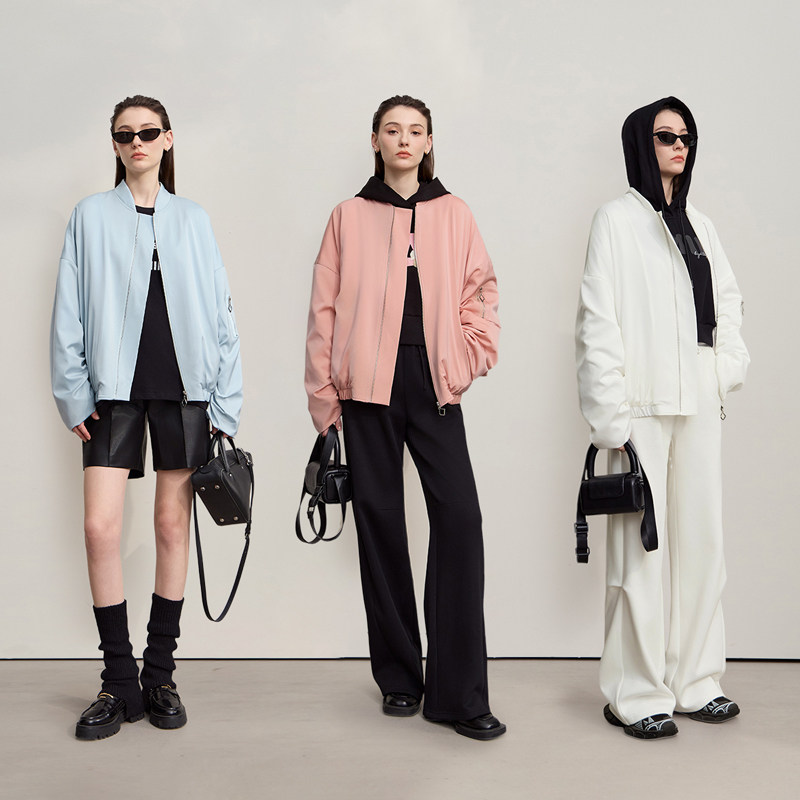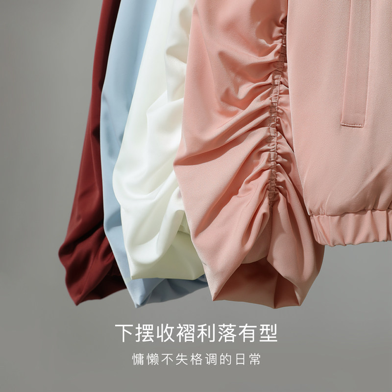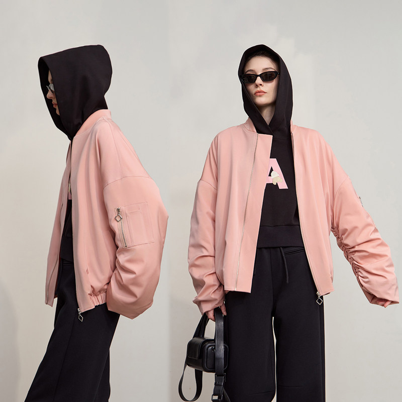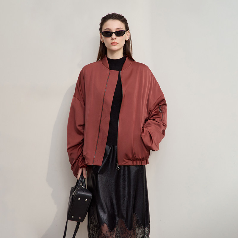 Amii2026冬新款 口外套 休闲运动风棒球领拉链落肩夹丝绵宽松褶皱袖