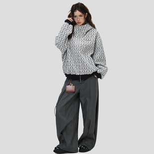 设计感口袋百搭显瘦外套潮 新款 灰色双拉链高领开衫 卫衣女2025秋季
