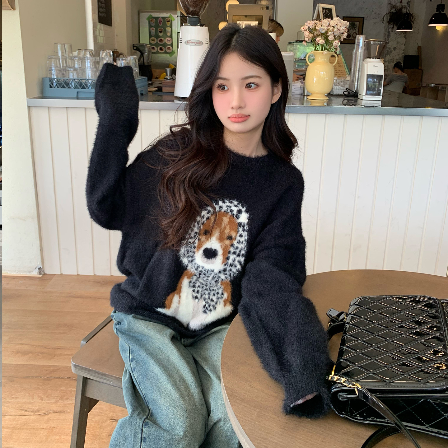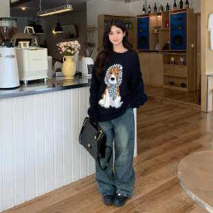 橘子树在哪儿韩系小狗印花毛衣女秋季 慵懒软糯宽松显瘦套头针织衫