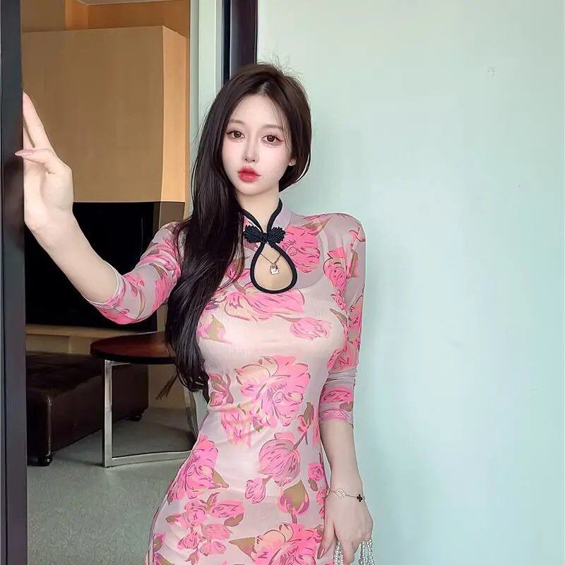 辣妹修身 2025款 气质包臀裙 旗袍连衣裙女夏季 纯欲风开叉印花改良版