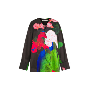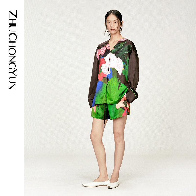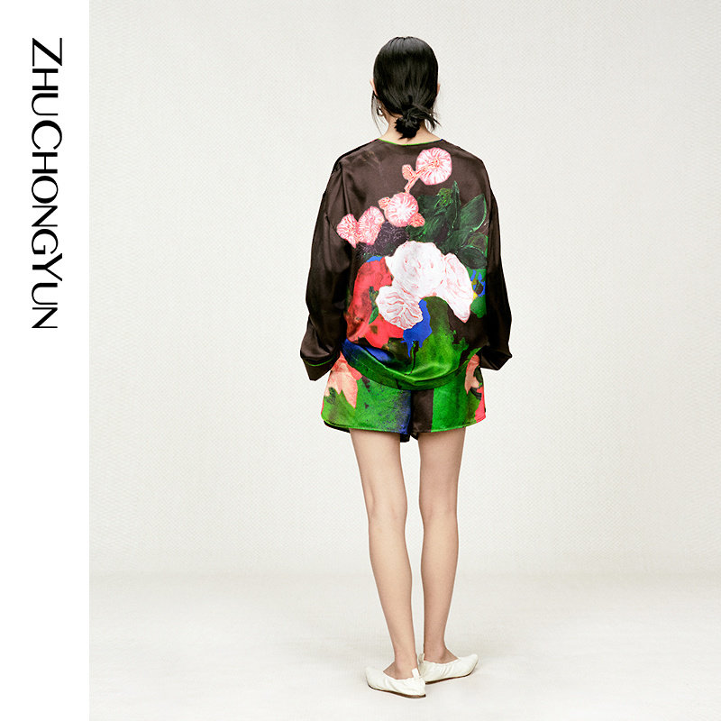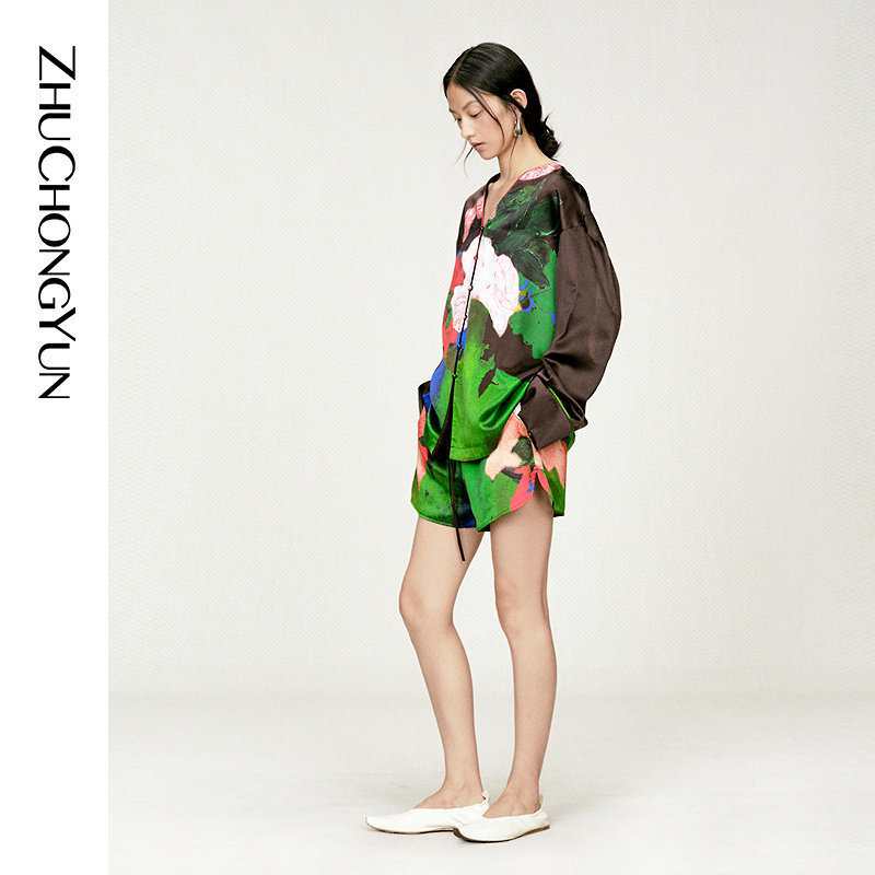 ZHUCHONGYUN2025冬新款 口女 花稿廓形上衣V领剪裁拼接袖