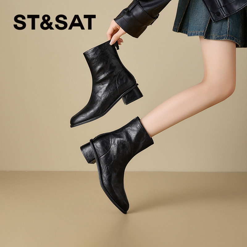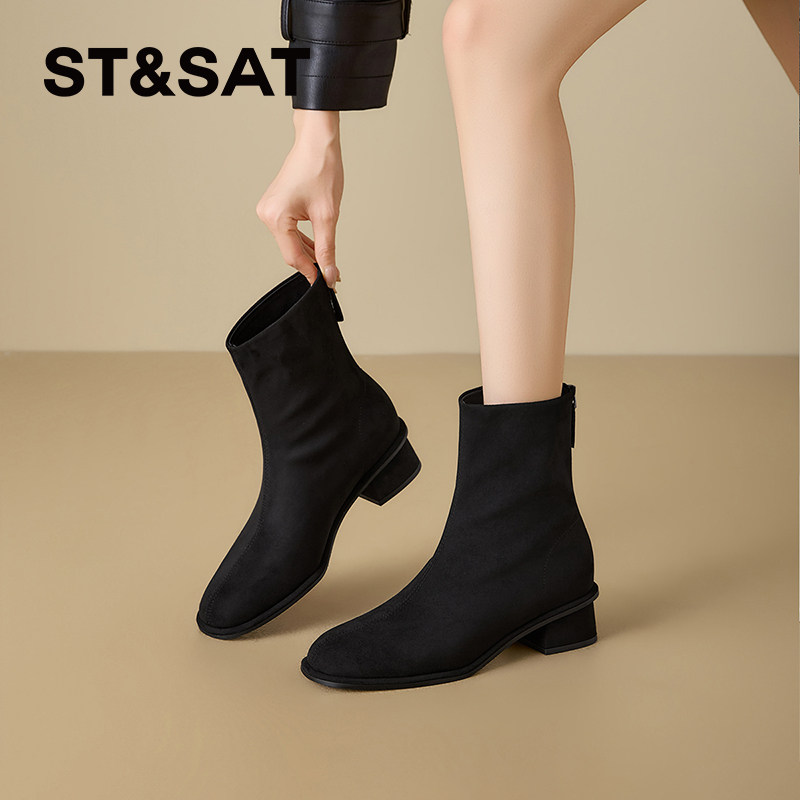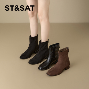 星期六巨舒服复古棕色绒面粗跟中跟短靴女靴2025秋冬新款 瘦瘦靴直