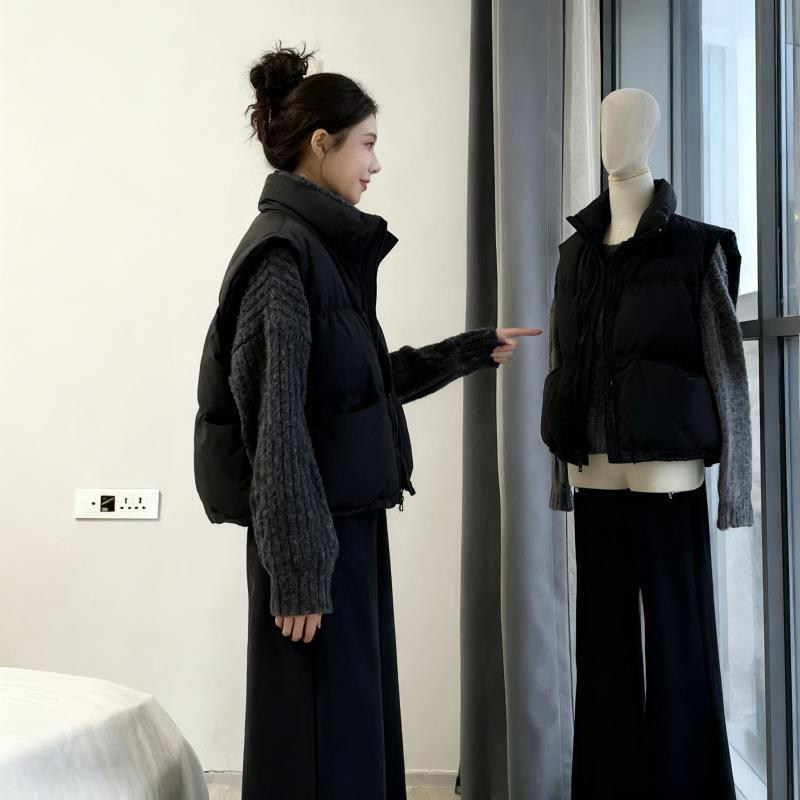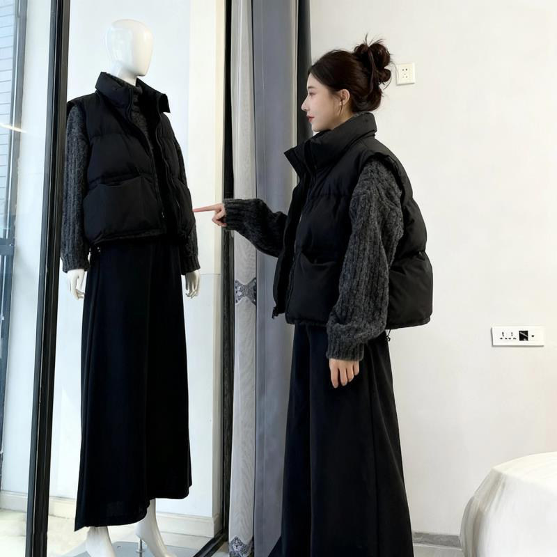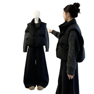 韩系穿搭简约风冬季 女 搭配一整套针织毛衣叠穿棉服马甲外套阔腿裤