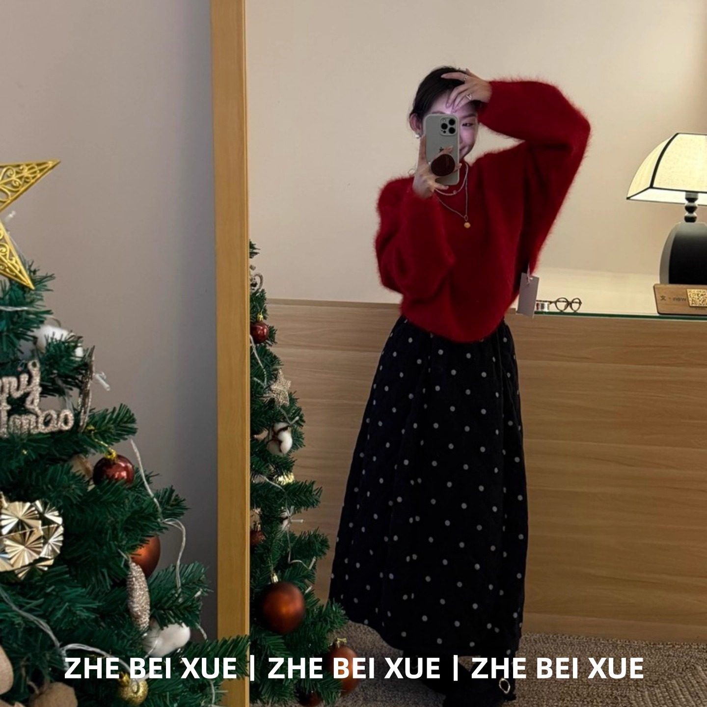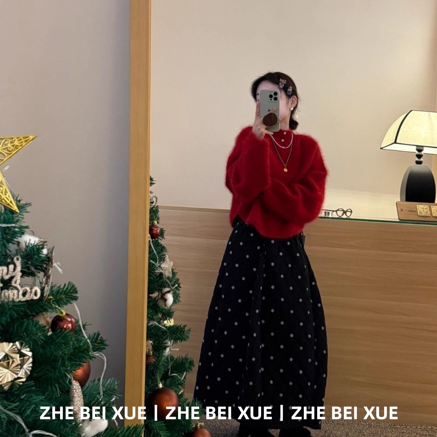套装 毛衣黑色波点花苞裙2026超火穿搭一整套 女韩系温柔风红色长袖