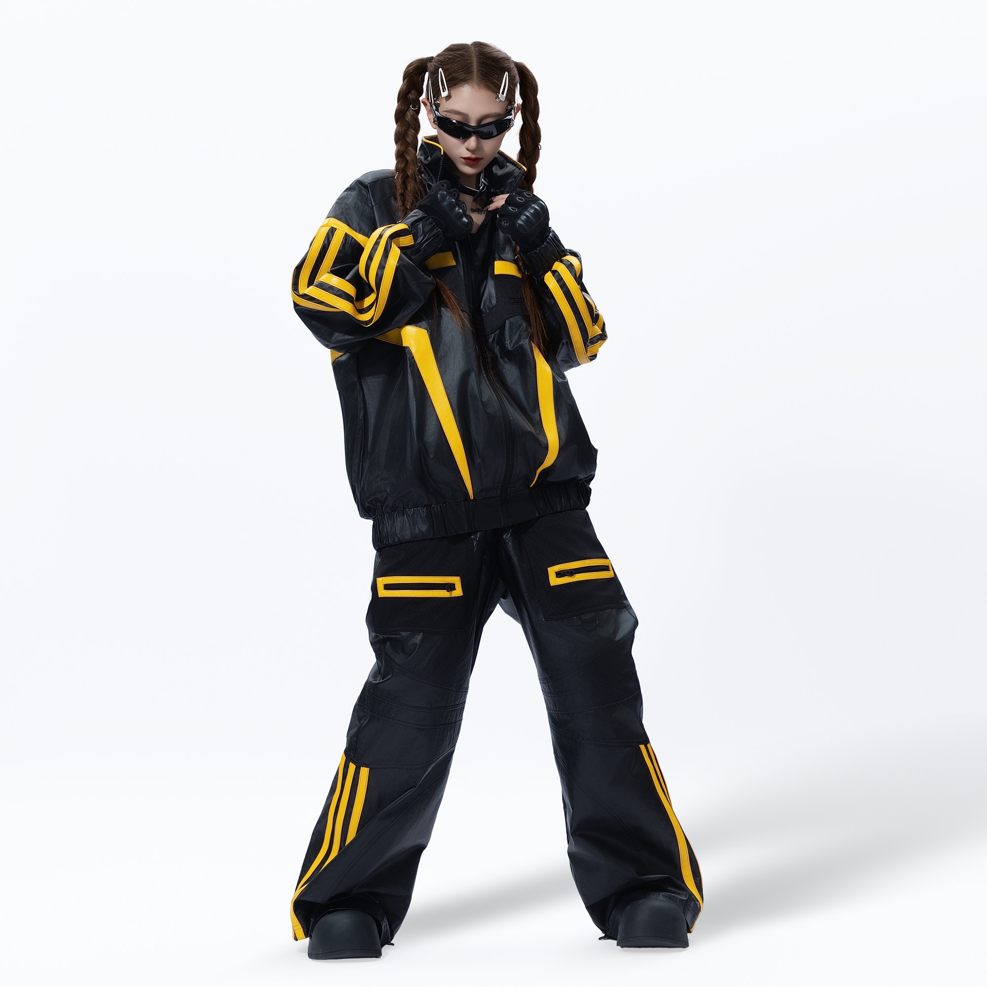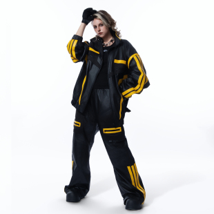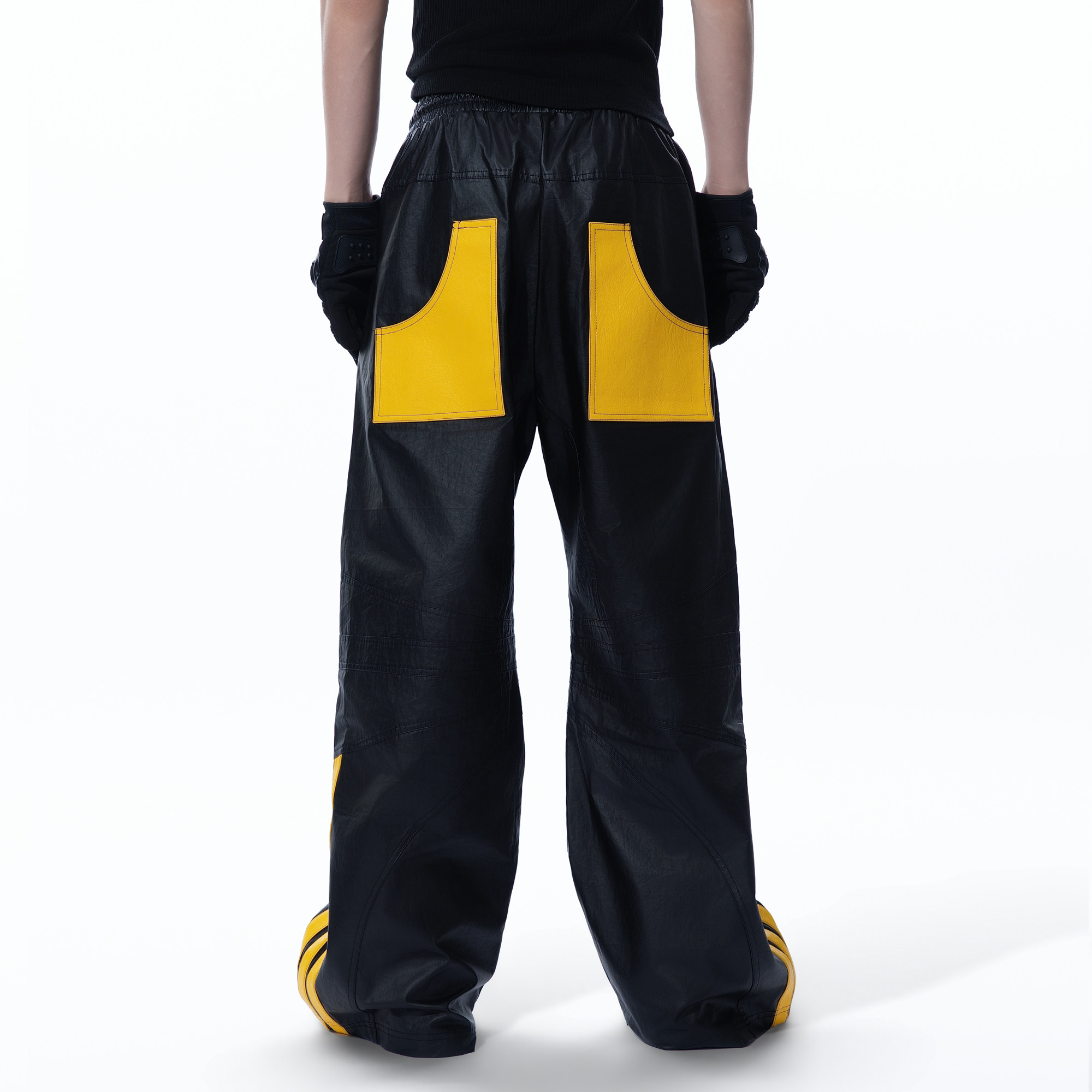 宽松重工设计感炸街机车风休闲长裤 MOGONGSHE 黑黄撞色PU皮阔腿裤