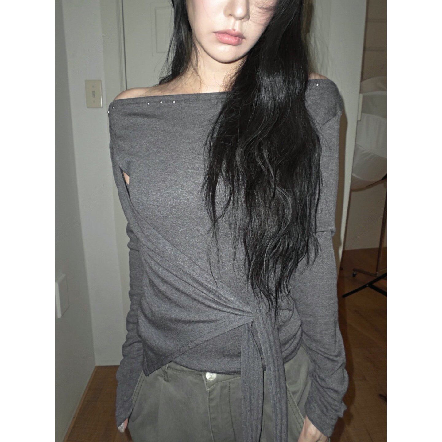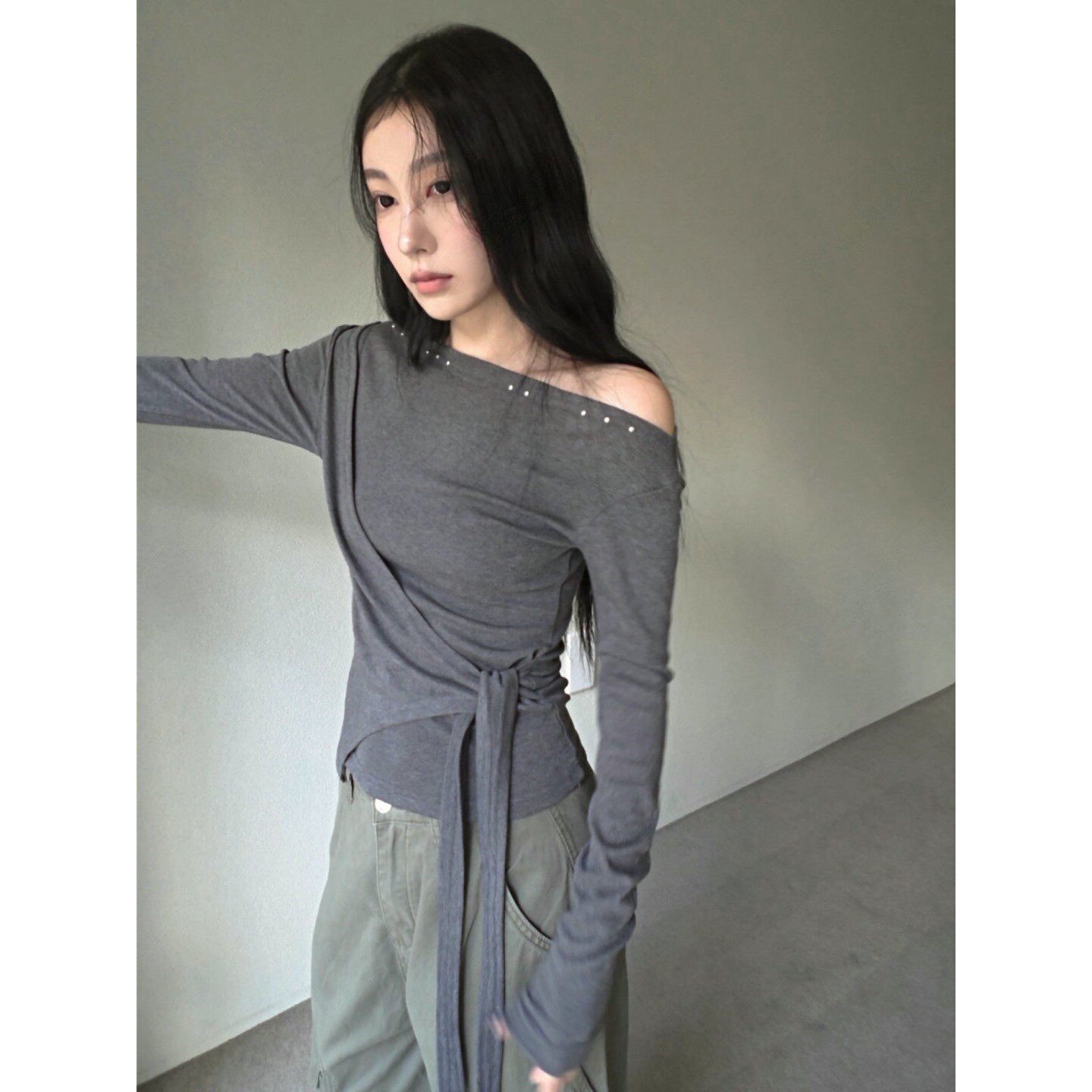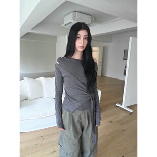 T恤女秋冬新款 小众设计铆钉露肩系带收腰长袖 东大门代购 直邮