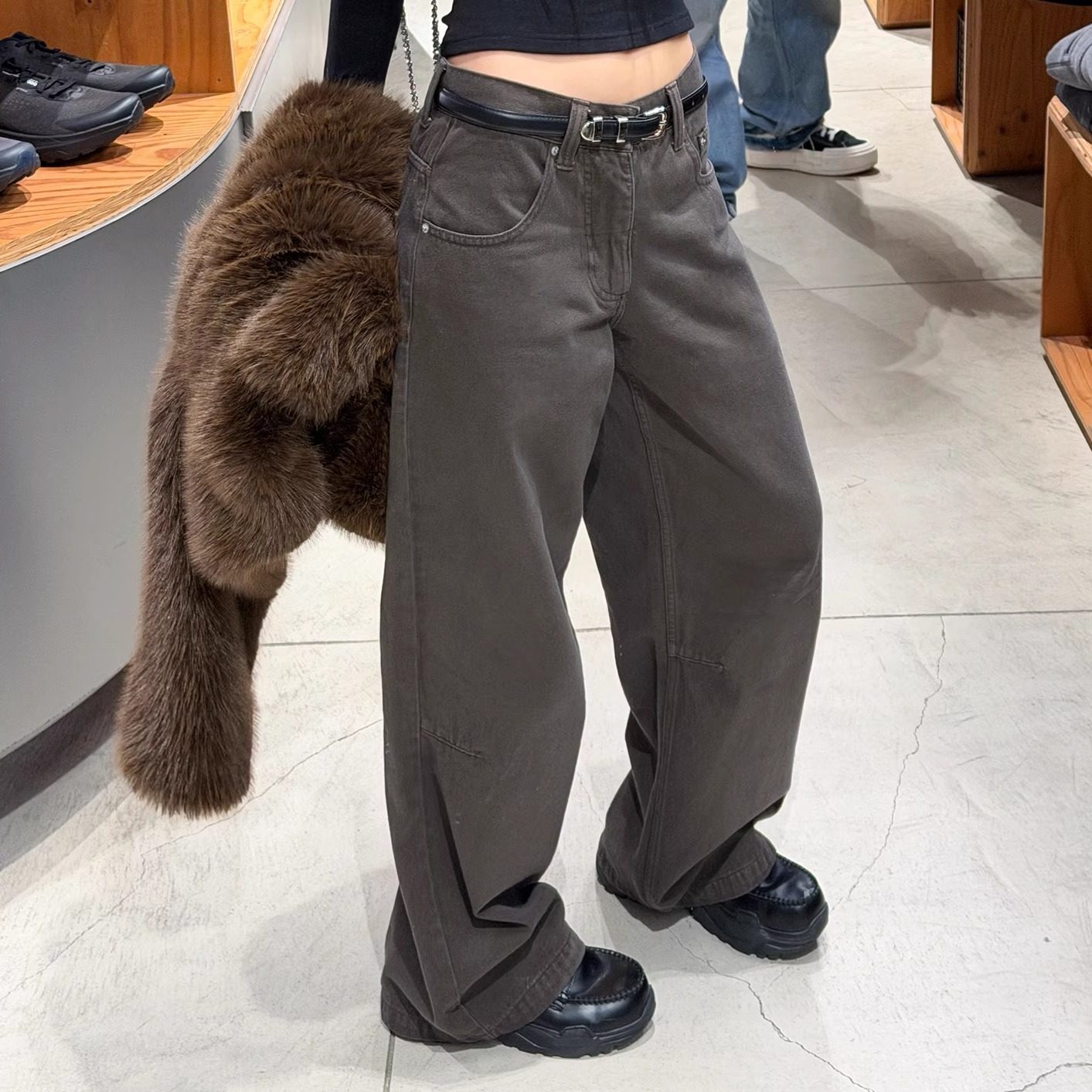 宽松显瘦百搭水泥灰双扣拖地直筒裤 新款 女高腰2025冬季 阔腿牛仔裤