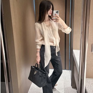 百搭气质上衣女 木耳领衬衫 仙草宝相提花缎真丝桑蚕丝白色法式 长袖