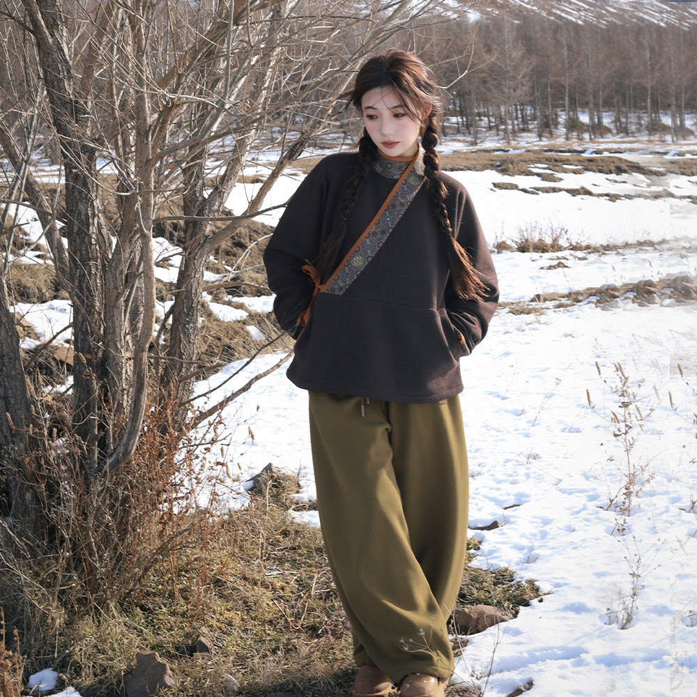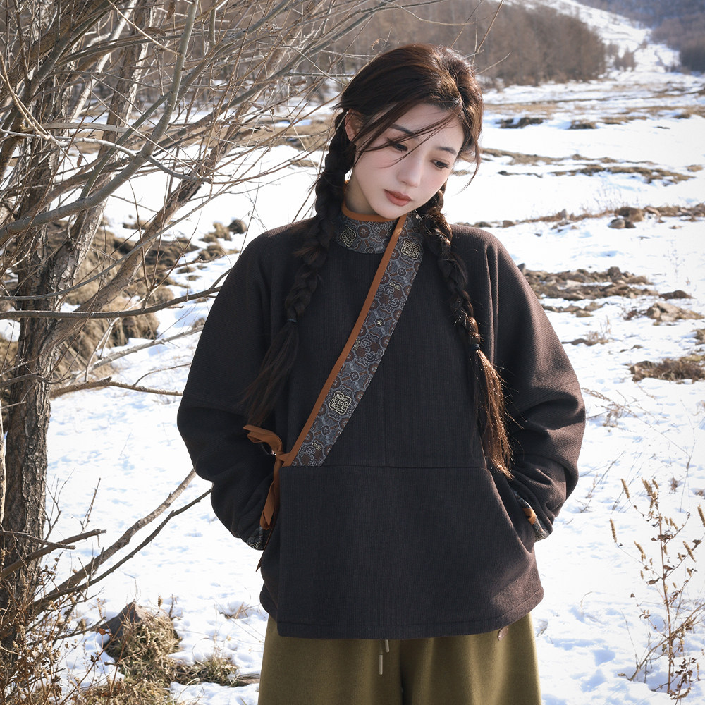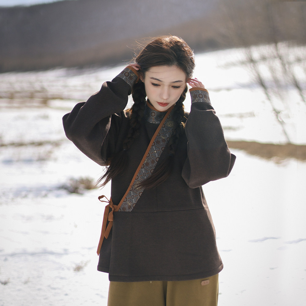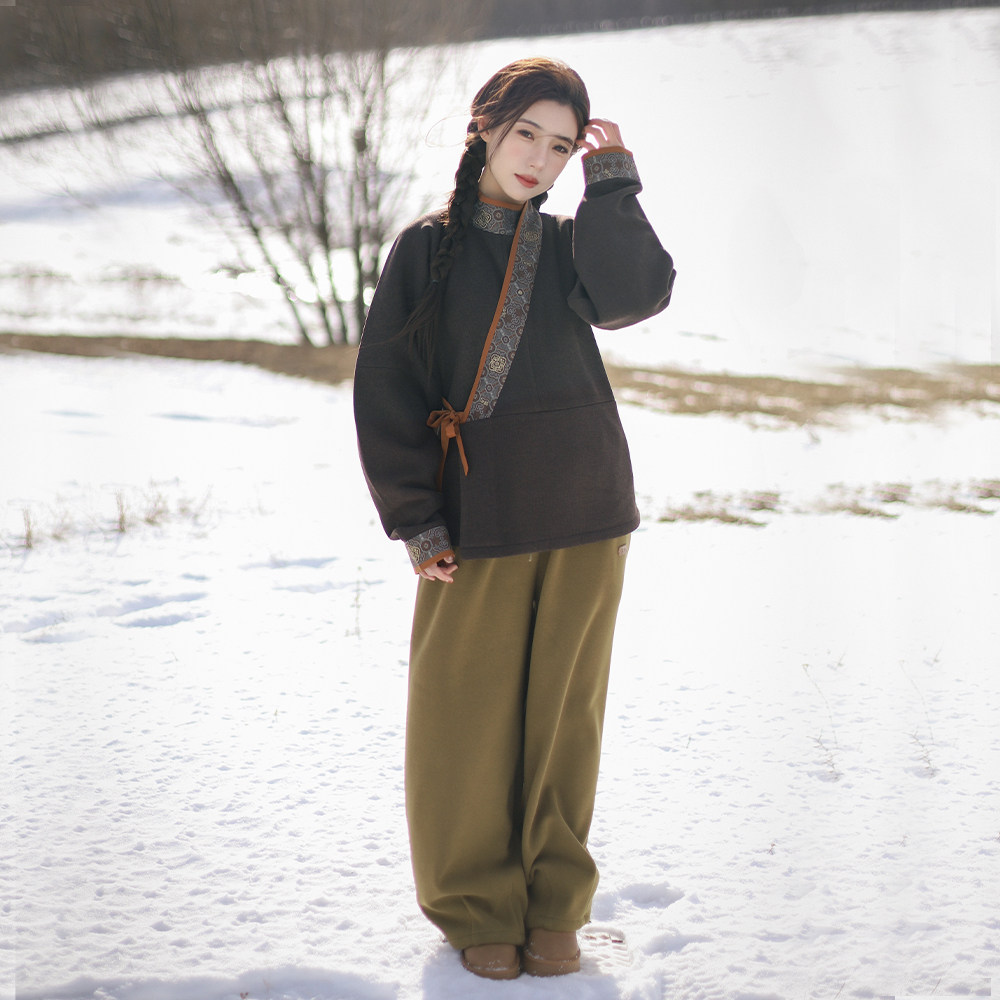 棕风渡 秋冬打底汉服上衣内搭魏晋曲领襦有口袋 晋制加绒曲领衫