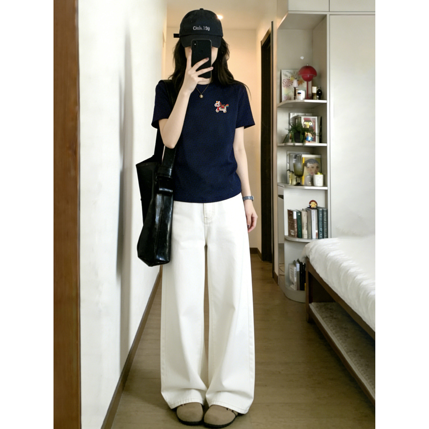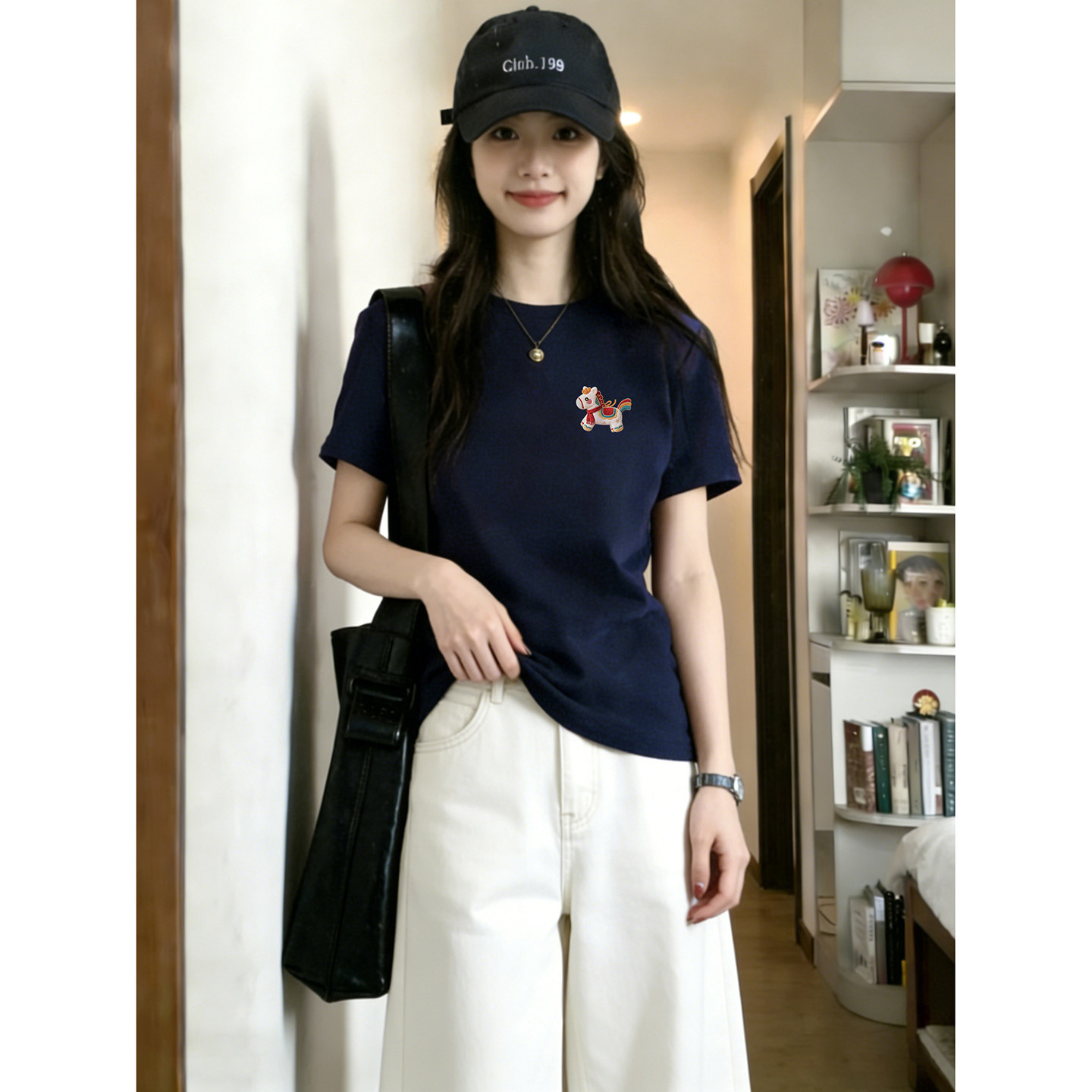 胖MM大码 藏蓝色小马印花正肩短袖 新款 2026夏季 圆领上衣潮 T恤女装