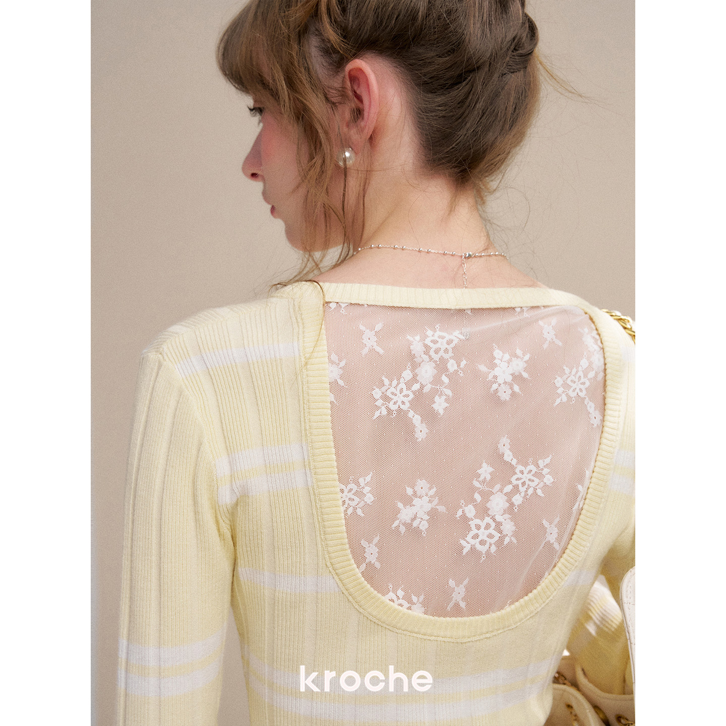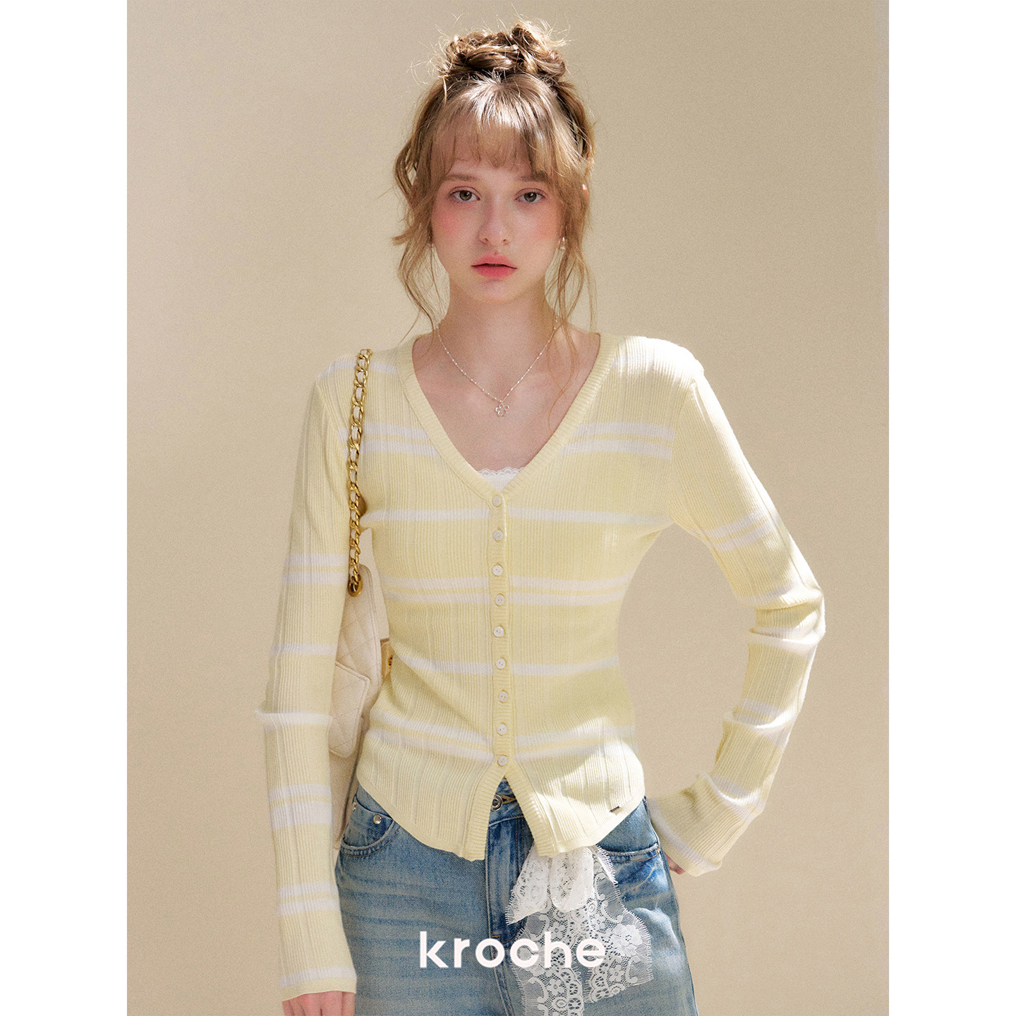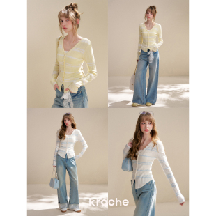 26ss 针织开衫 浪漫蕾丝 撞色条纹V领长袖 镂空蕾丝拼接 Kroche