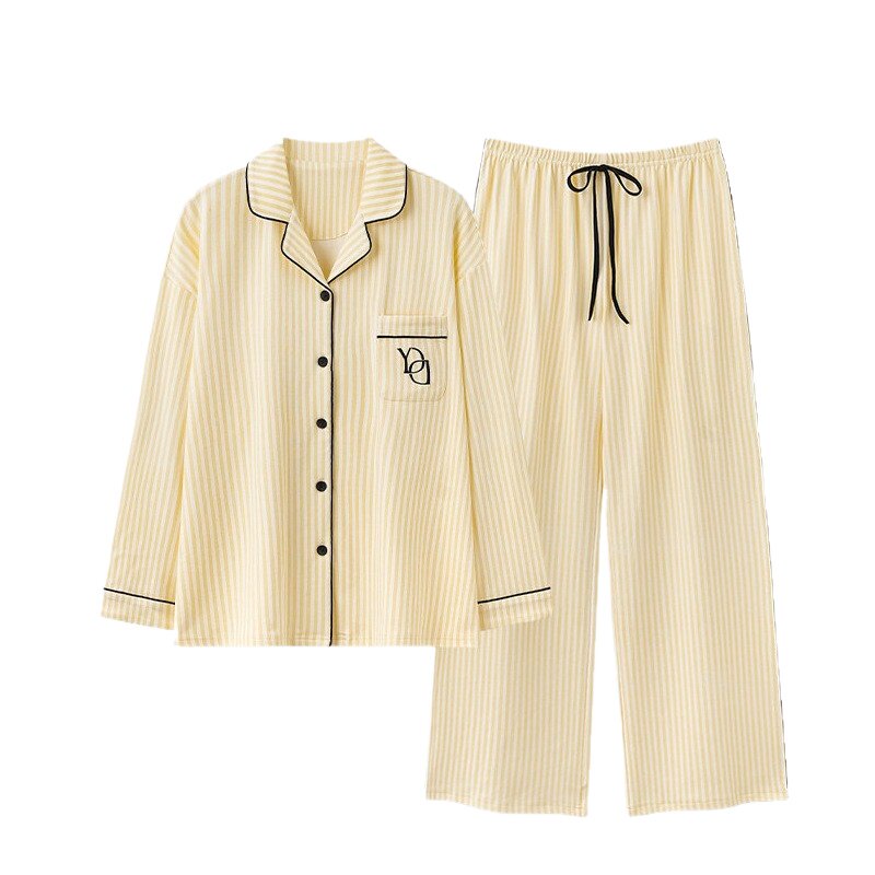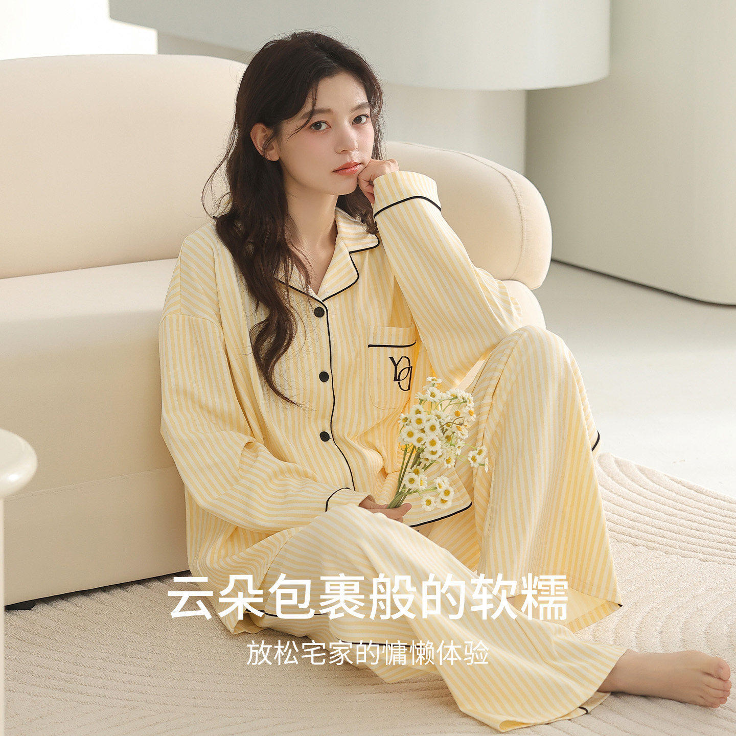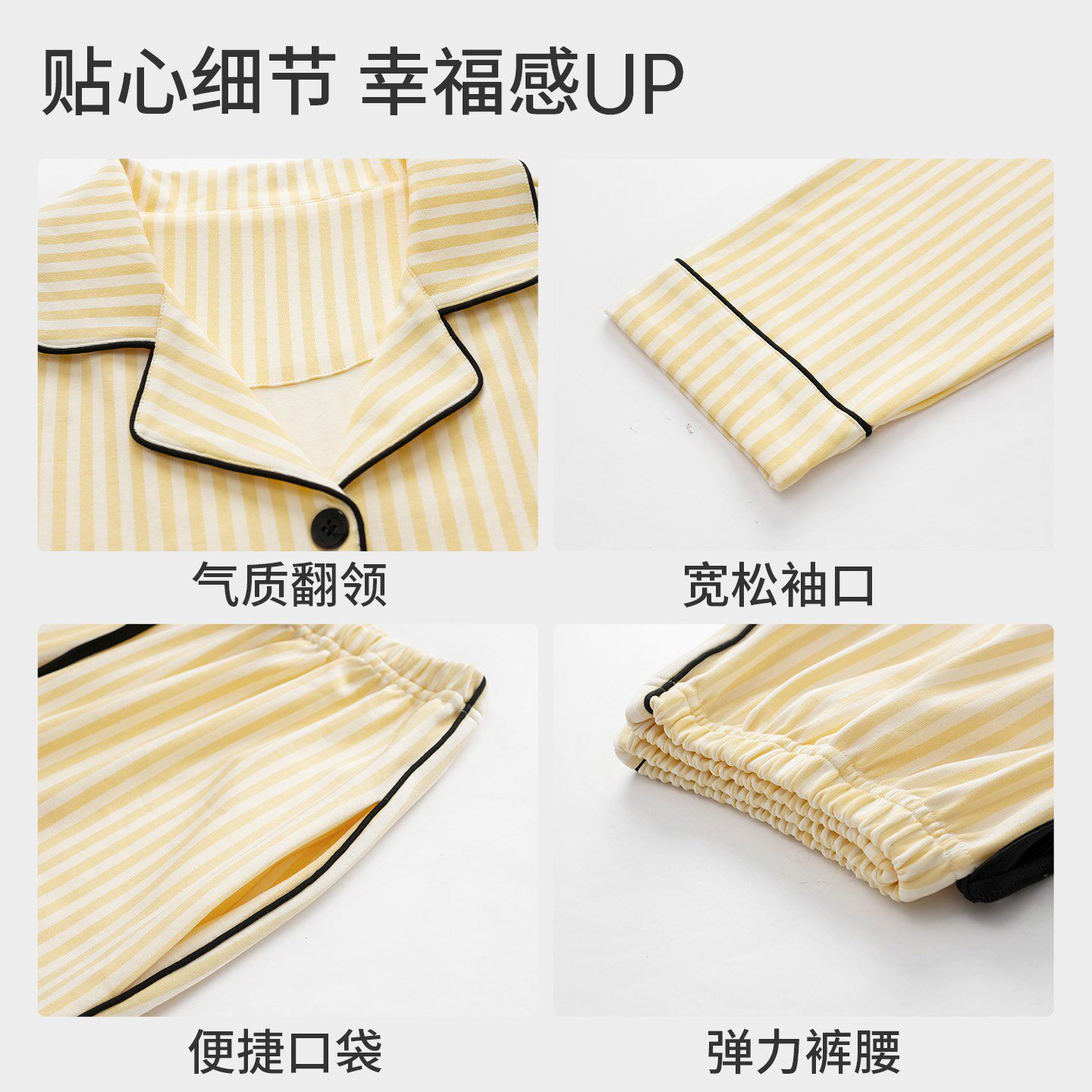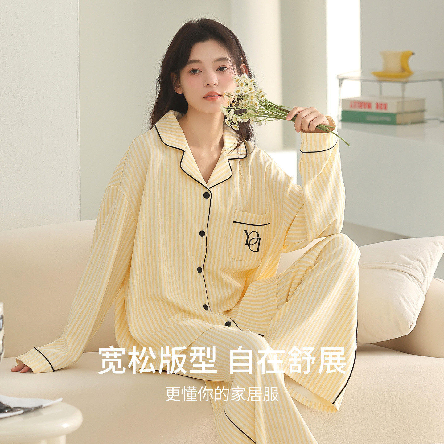 春夏长袖 100%纯棉睡衣女款 简约条纹可外穿全棉女士家居服套装 包邮