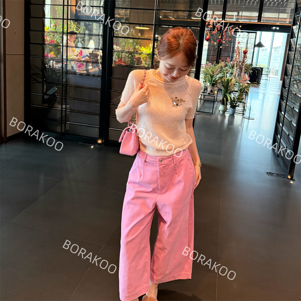 水桃粉立体剪裁九分直筒裤