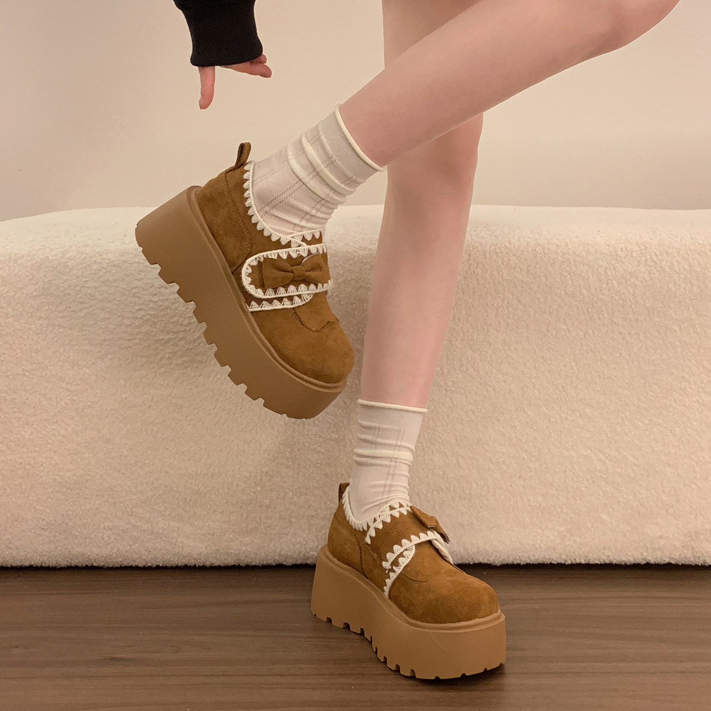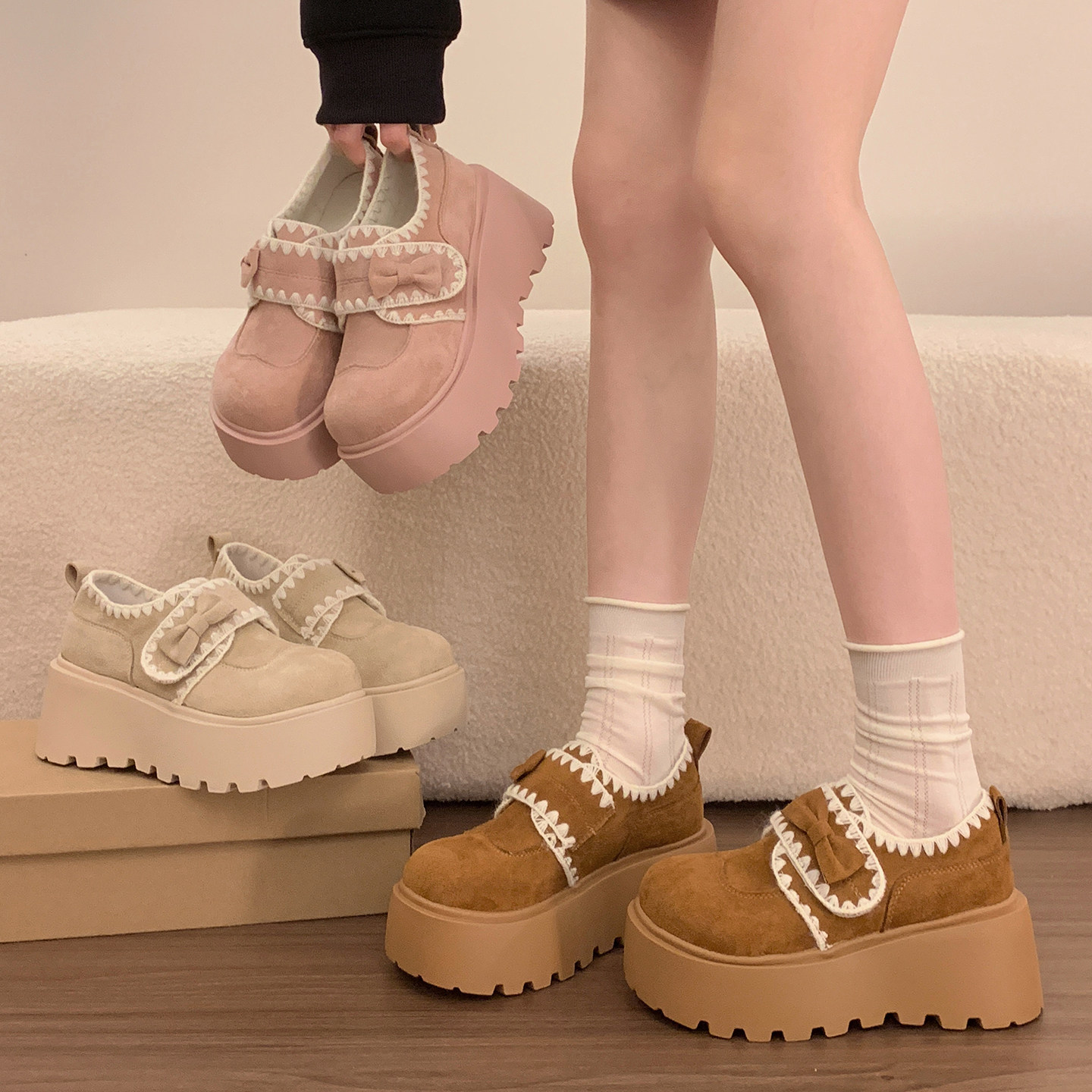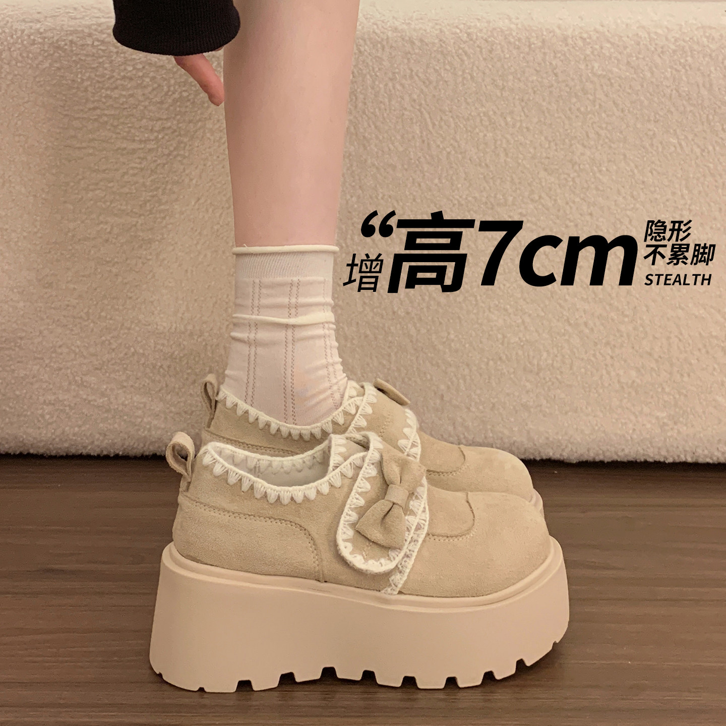 百搭蝴蝶结单鞋 春夏魔术贴乐福鞋 女2026新款 小个子厚底增高勃肯鞋