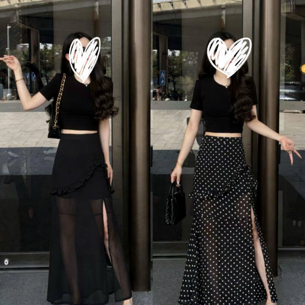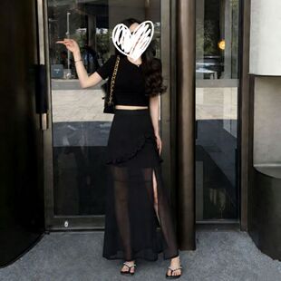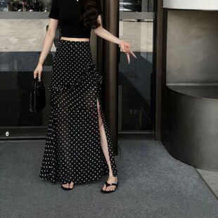 复古波点半身裙女夏黑色高腰开叉半裙长裙显瘦百搭不规则包臀裙子