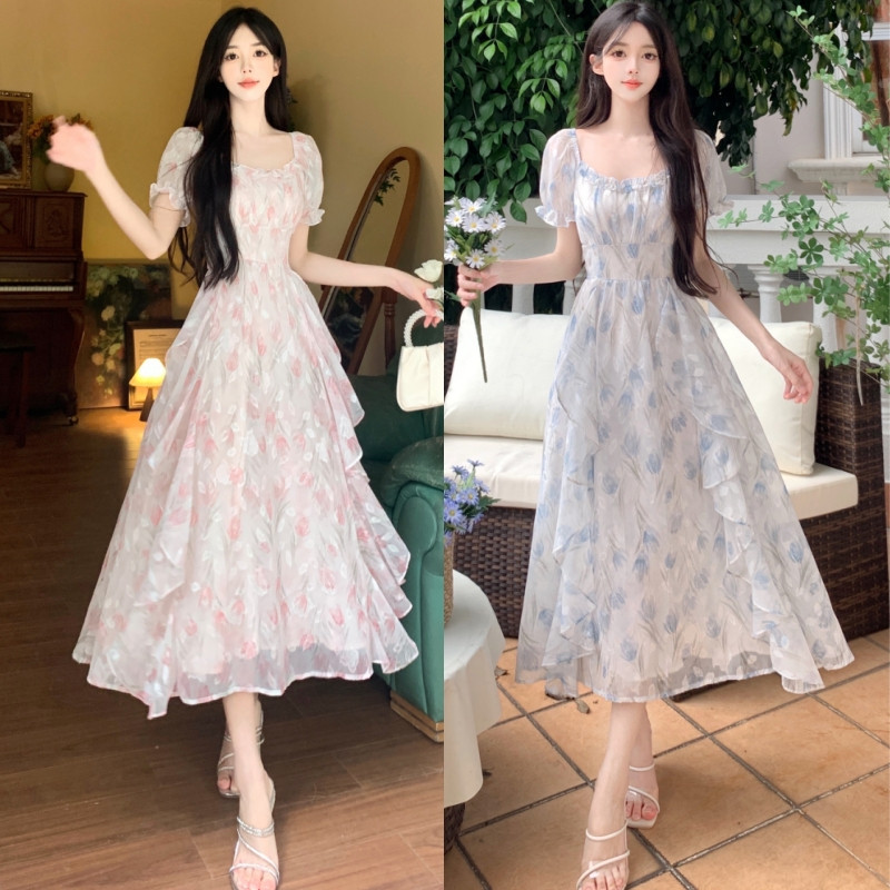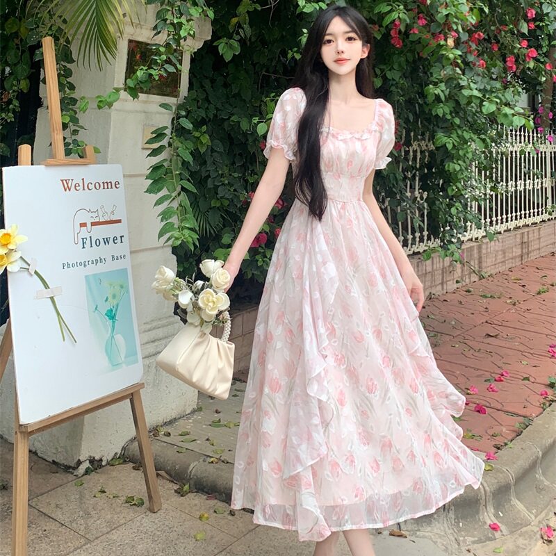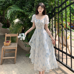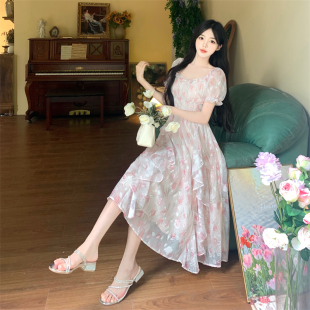 胖mm收腰显瘦气质优雅长裙 温柔仙女碎花方领连衣裙女夏季 大码 法式