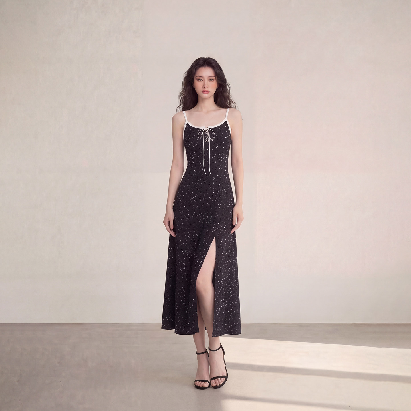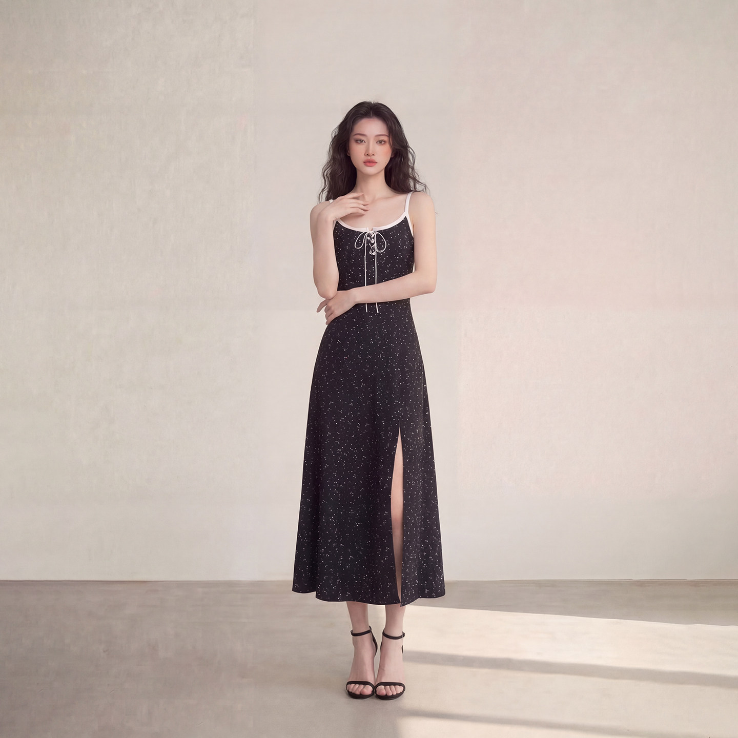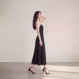 艾格法式 碎花吊带连衣裙女黑色系带开叉长裙收腰显瘦气质裙A字裙