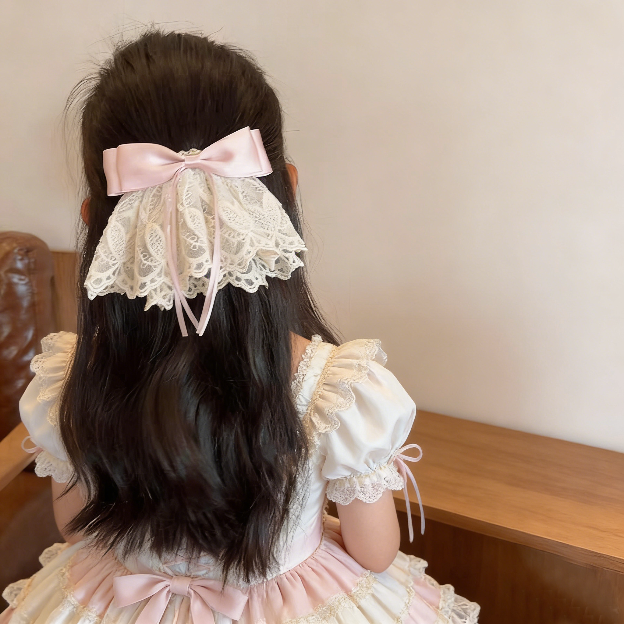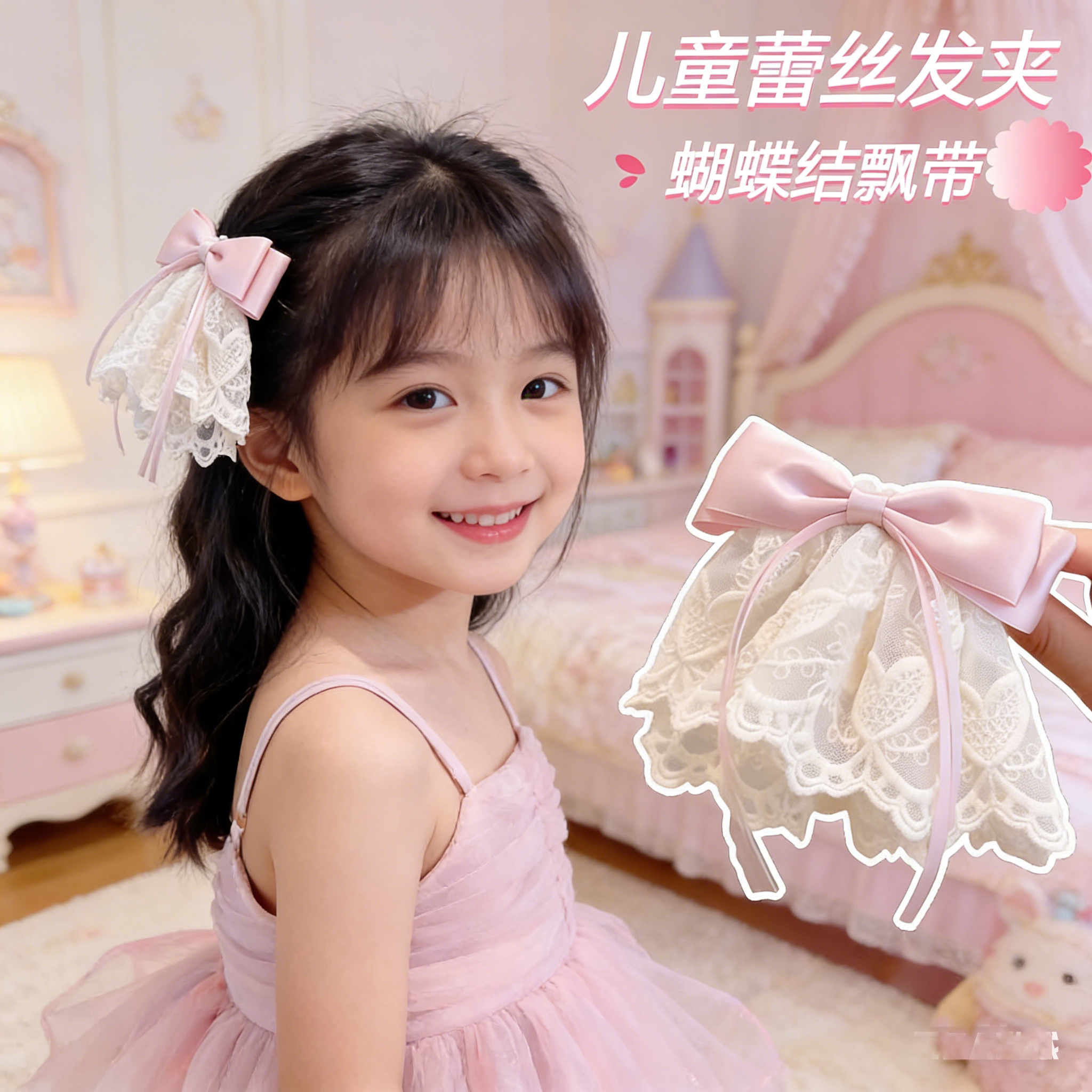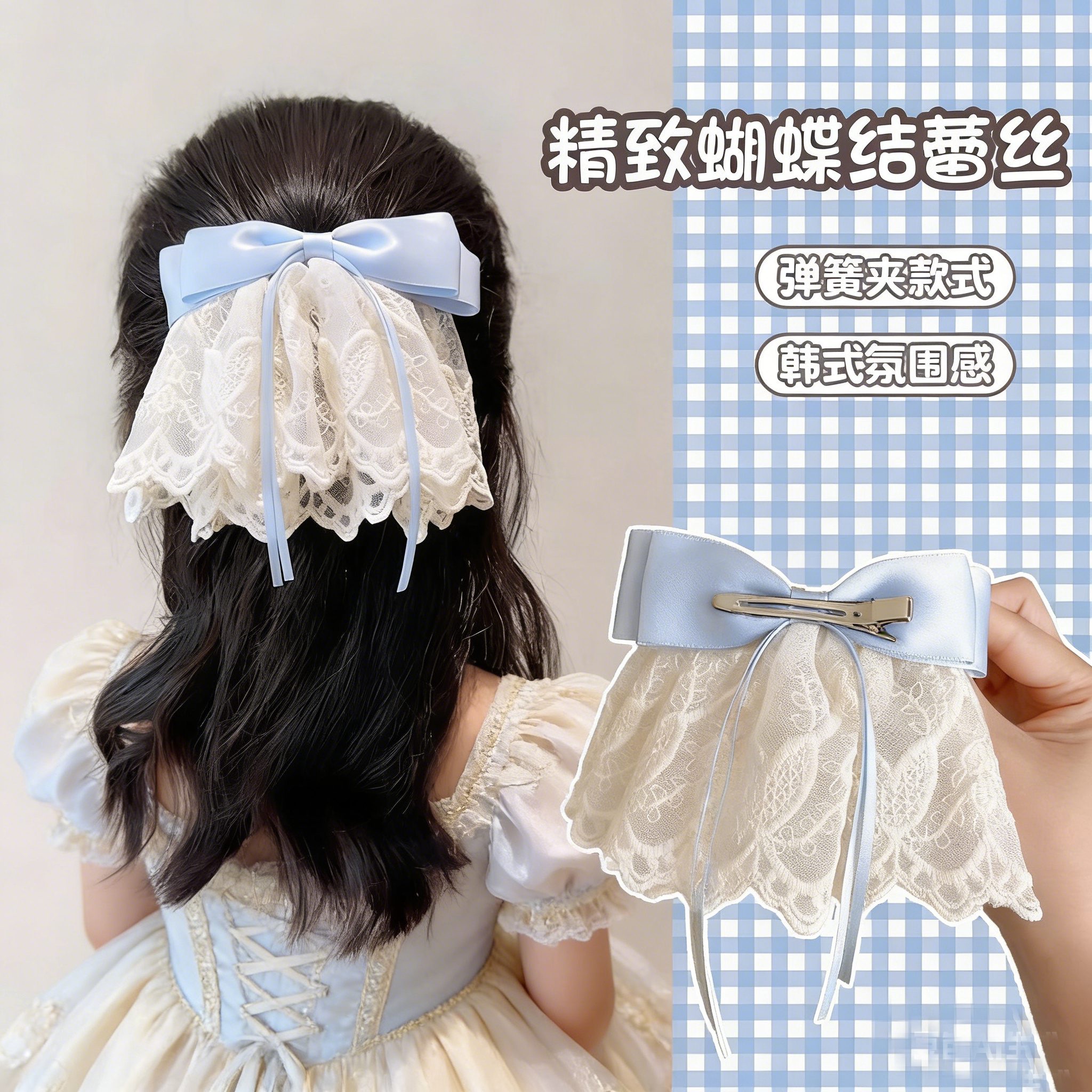蕾丝裙摆蝴蝶结丝带发夹高级感发饰后脑勺优美大发夹儿童浪漫法式