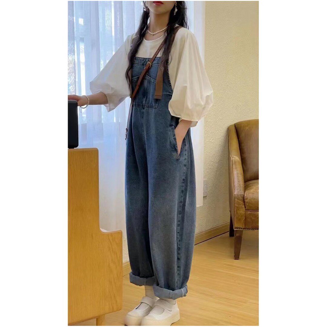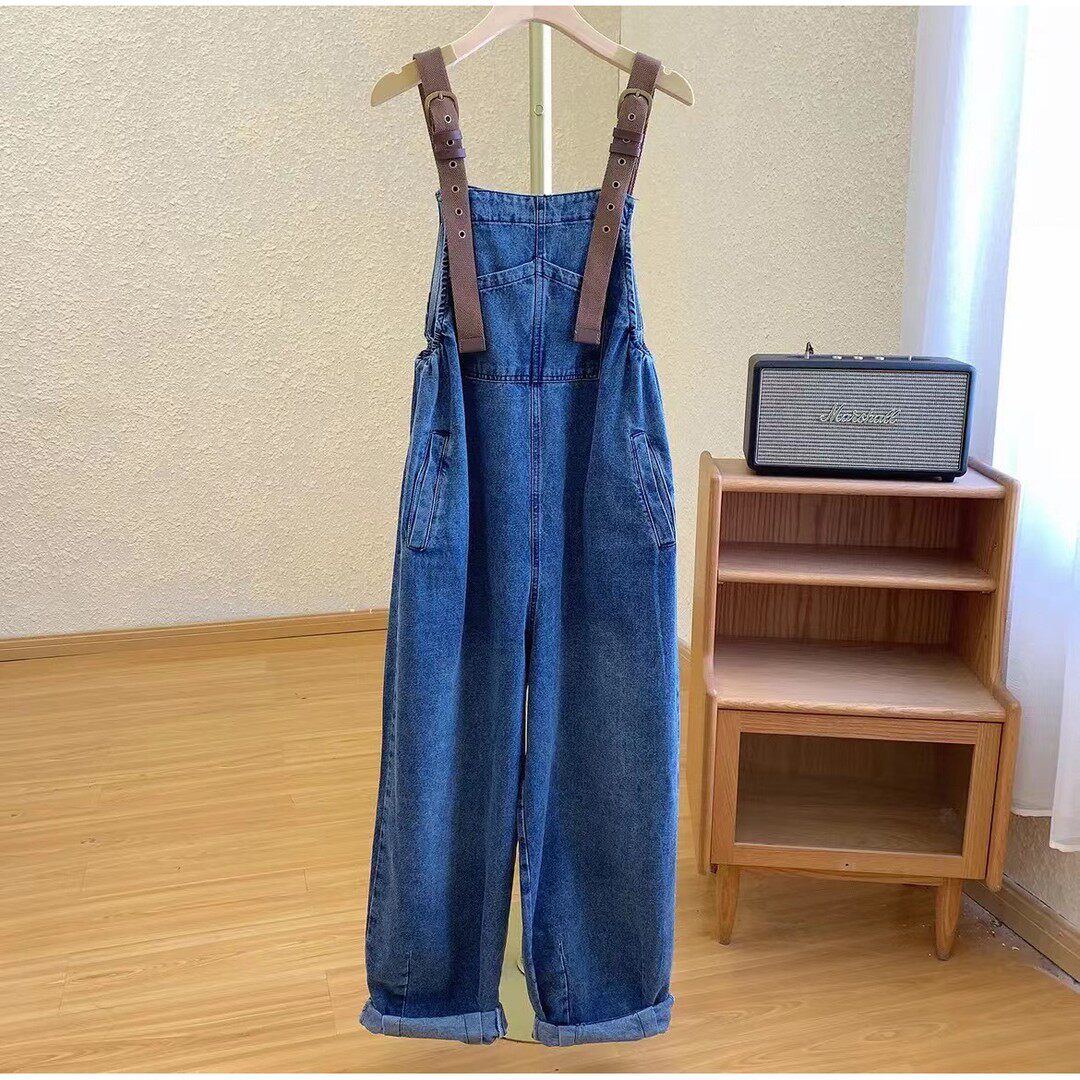 春夏时尚 子套装 新款 宽松多口袋休闲牛仔阔腿连体裤 套装 孕妇背带裤