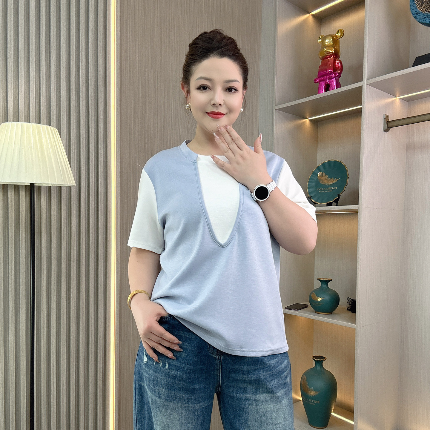 新品 大码 T恤女胖mm夏季 假两件撞色短袖 宽松减龄遮肉显瘦上衣 女装