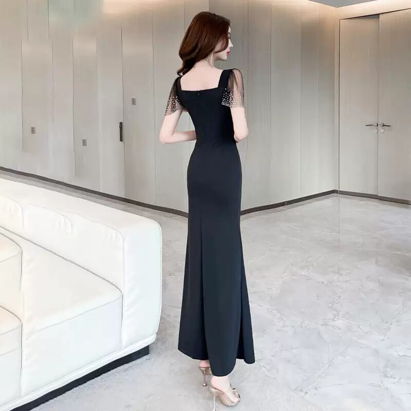 黑色深V领短袖 显瘦开叉包臀鱼尾裙性感连衣裙 晚礼服女镶钻修身