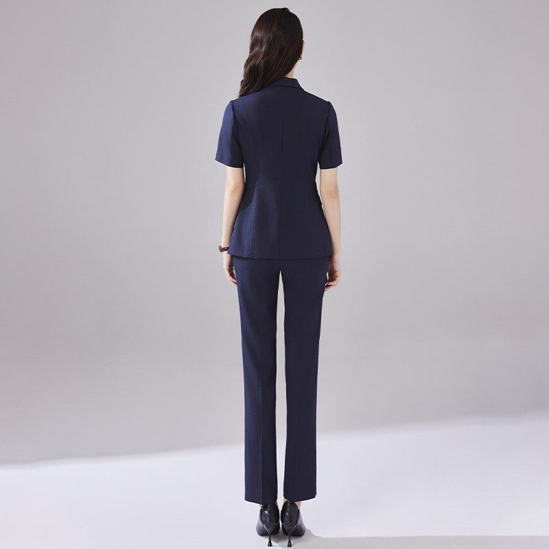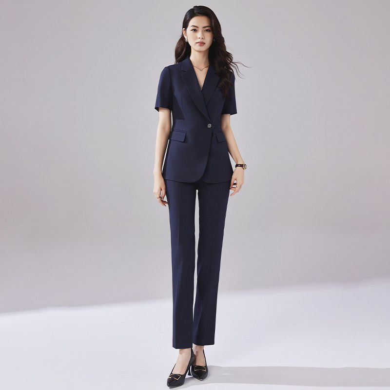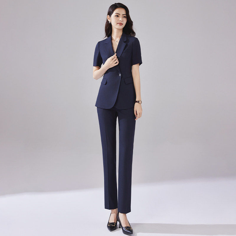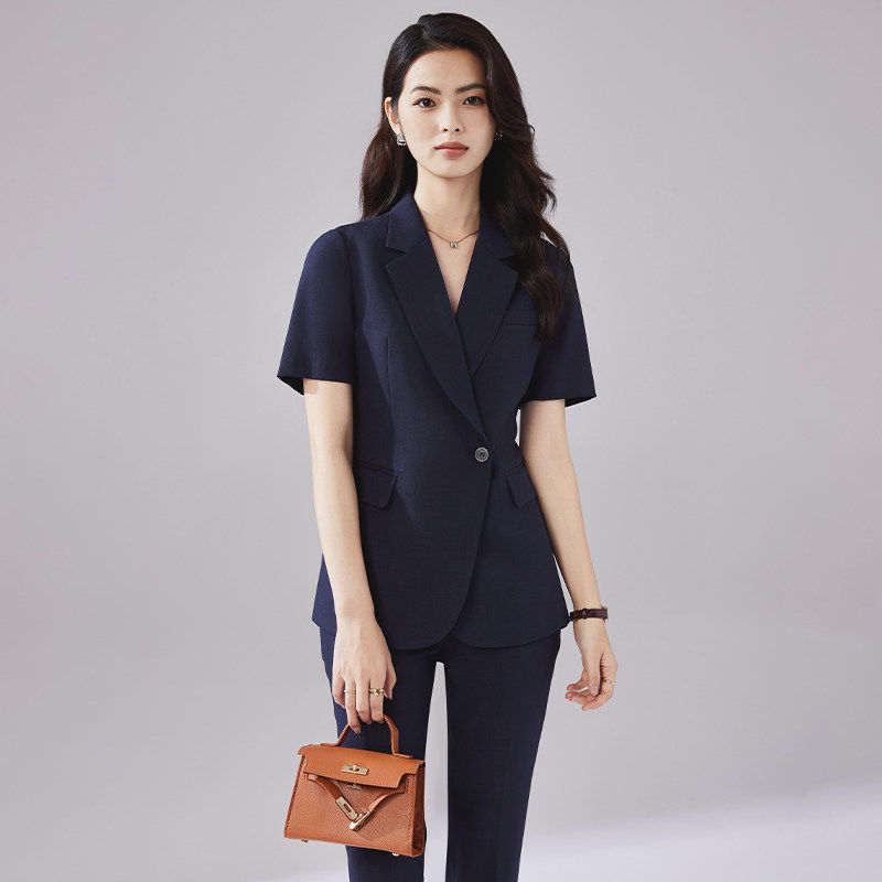 藏青色简约干练通勤职业装 诗璐雅一粒扣西装 短袖 女夏季 OL工服 套装