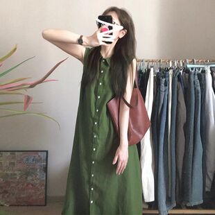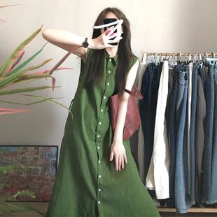 复古气质单排扣开衫 法式 夏季 连衣裙女2026新款 长裙子 绿色翻领无袖