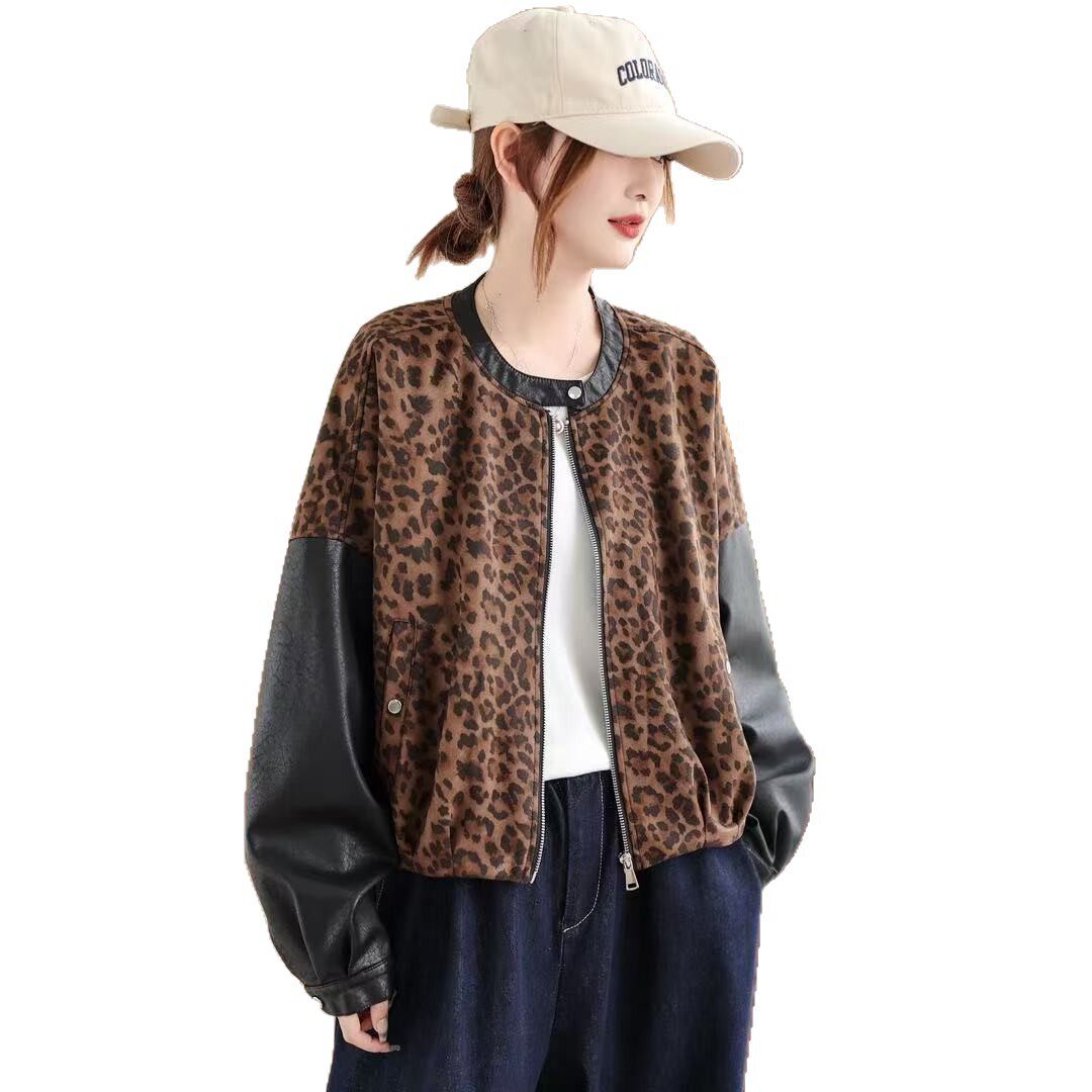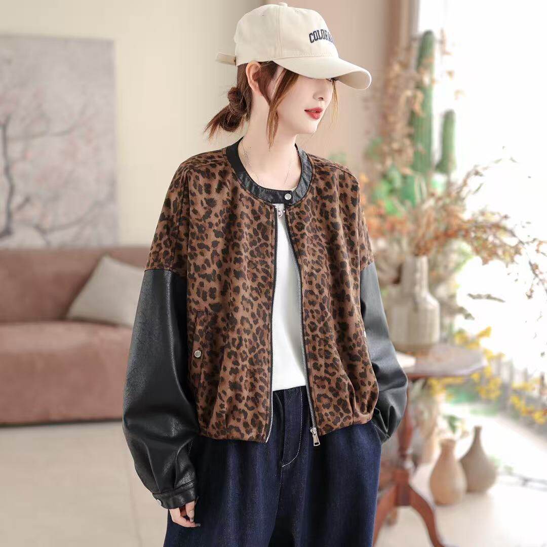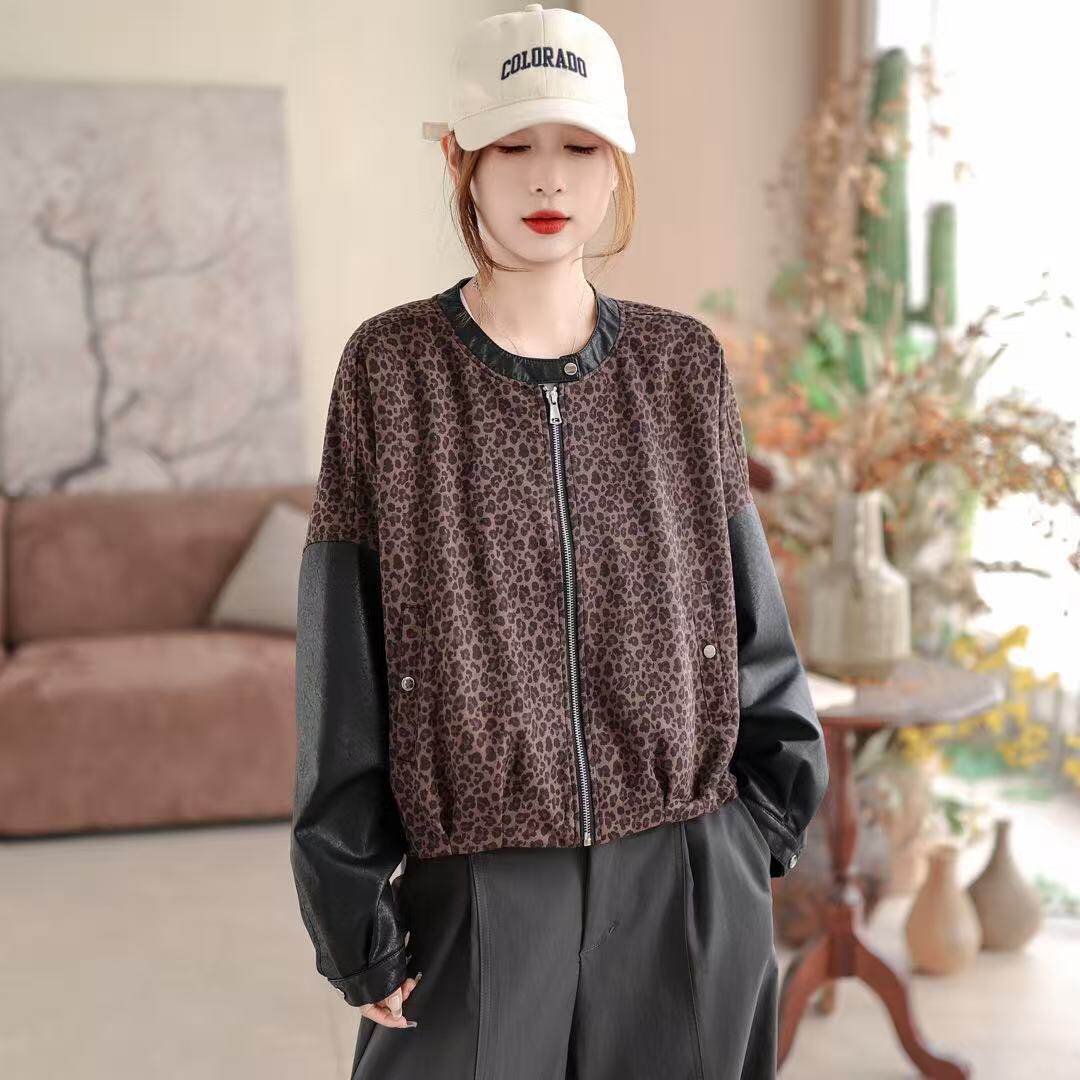 新款 26春款 开衫 外套长袖 外套 皮衣外套女豹纹拼接圆领宽松休闲韩版