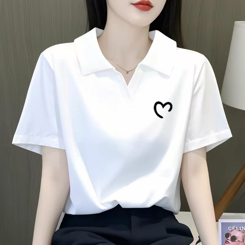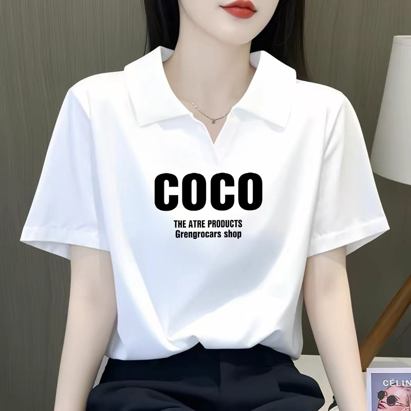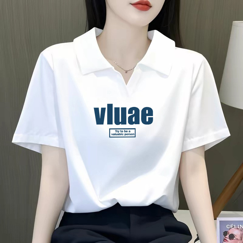 正肩体恤设计感小众简约字母上衣ins 宽松大码 polo领短袖 t恤女夏季