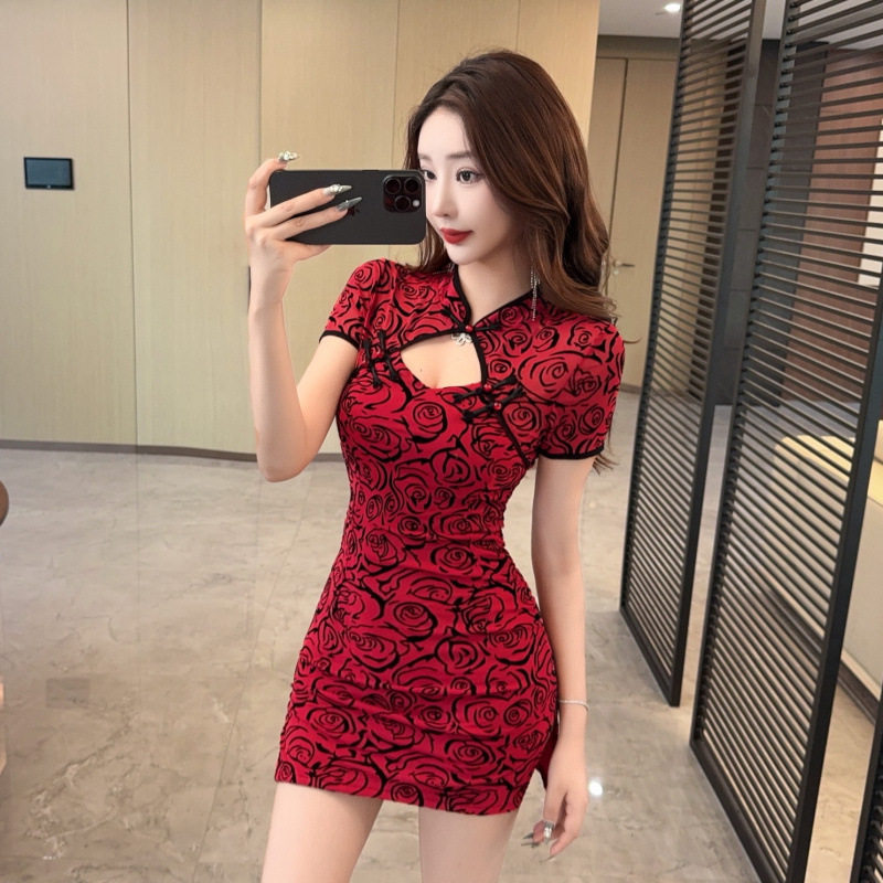 夜场工作服 改良旗袍印花植绒紧身包臀性感连衣裙新款 外贸女装 时尚