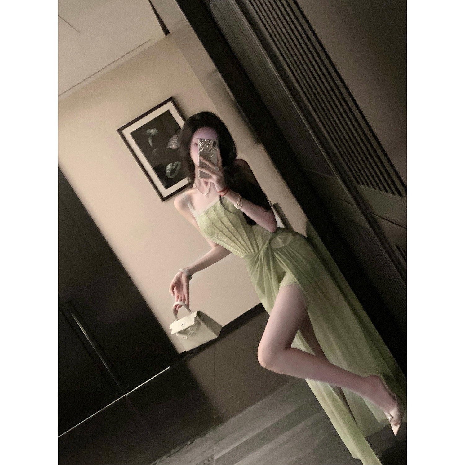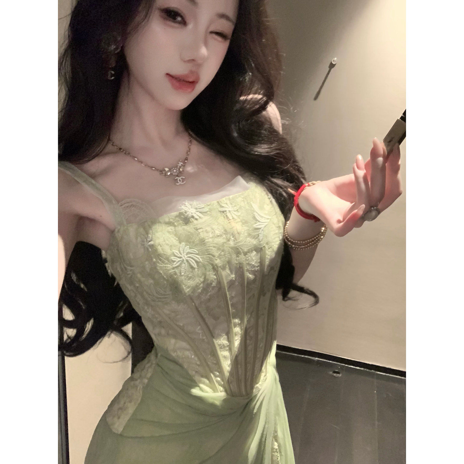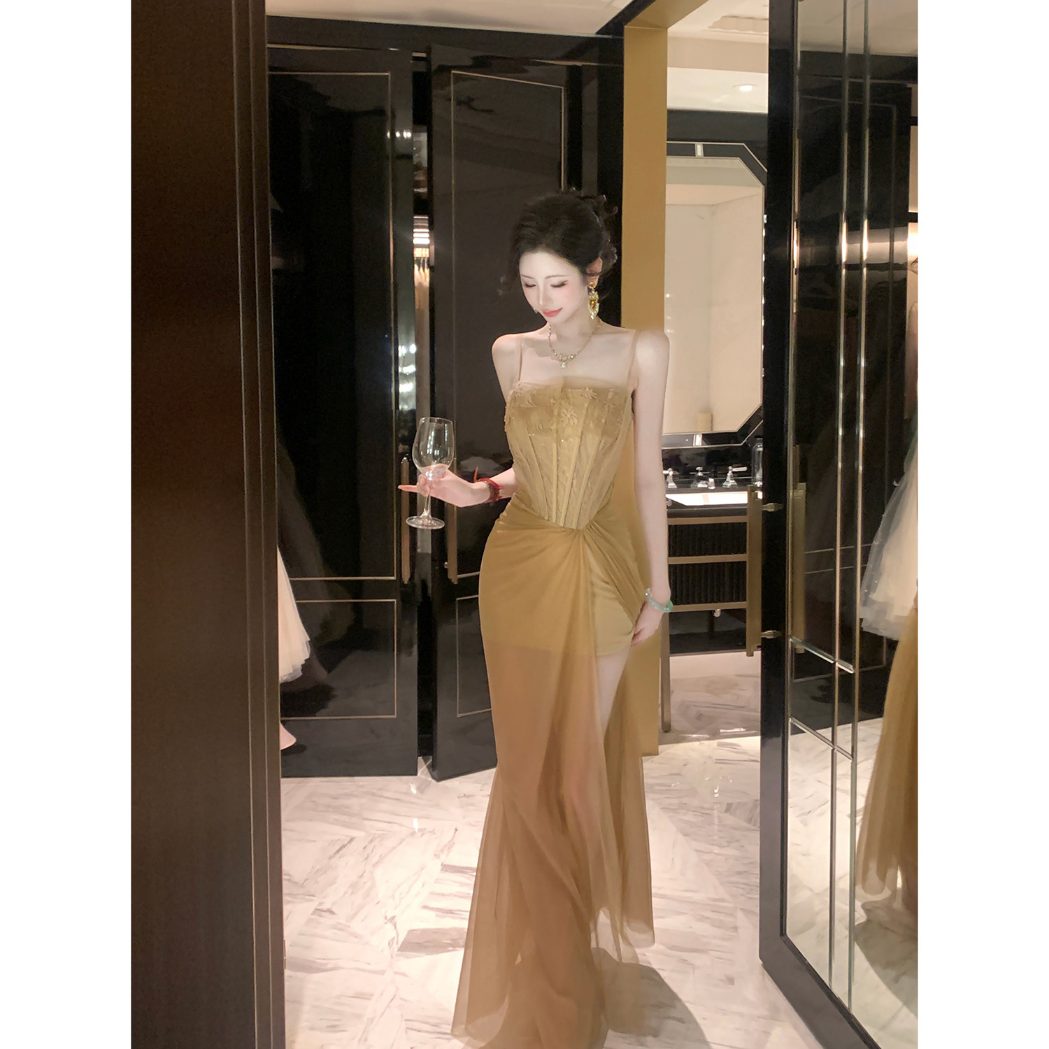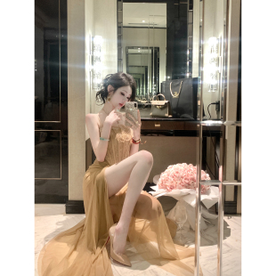 巨好看蕾丝网纱鱼骨收腰开衩吊带连衣长裙 夏装 Sun雅乔 雅典娜