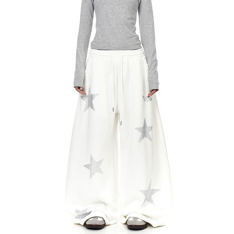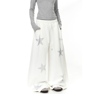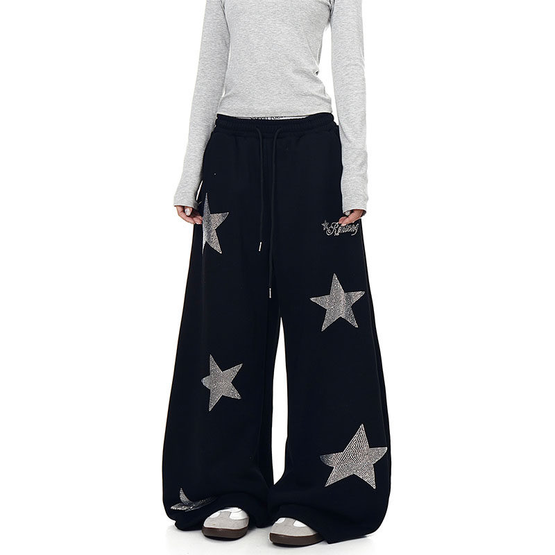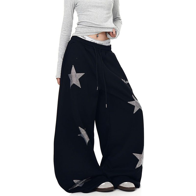 潮 女街头宽松百搭爵士舞运动休闲阔腿裤 美式 复古星星烫钻弯刀卫裤