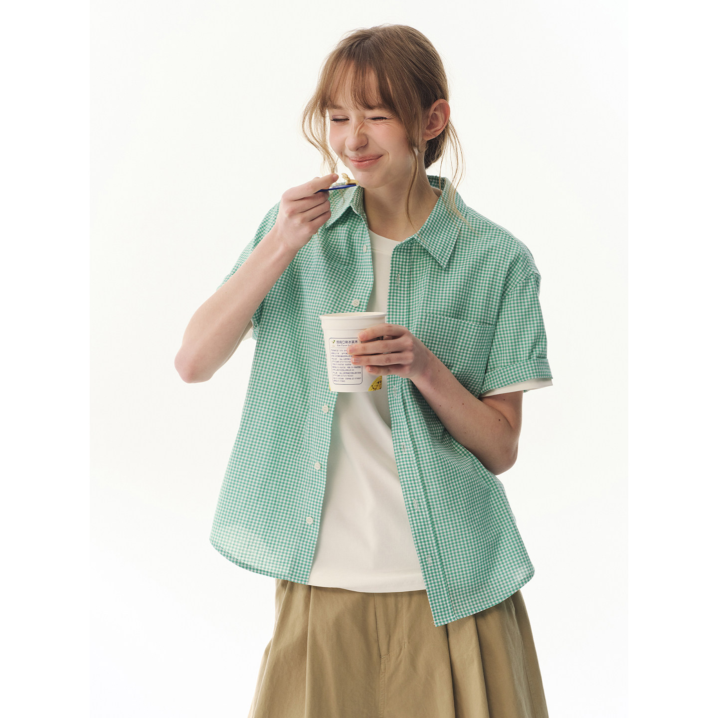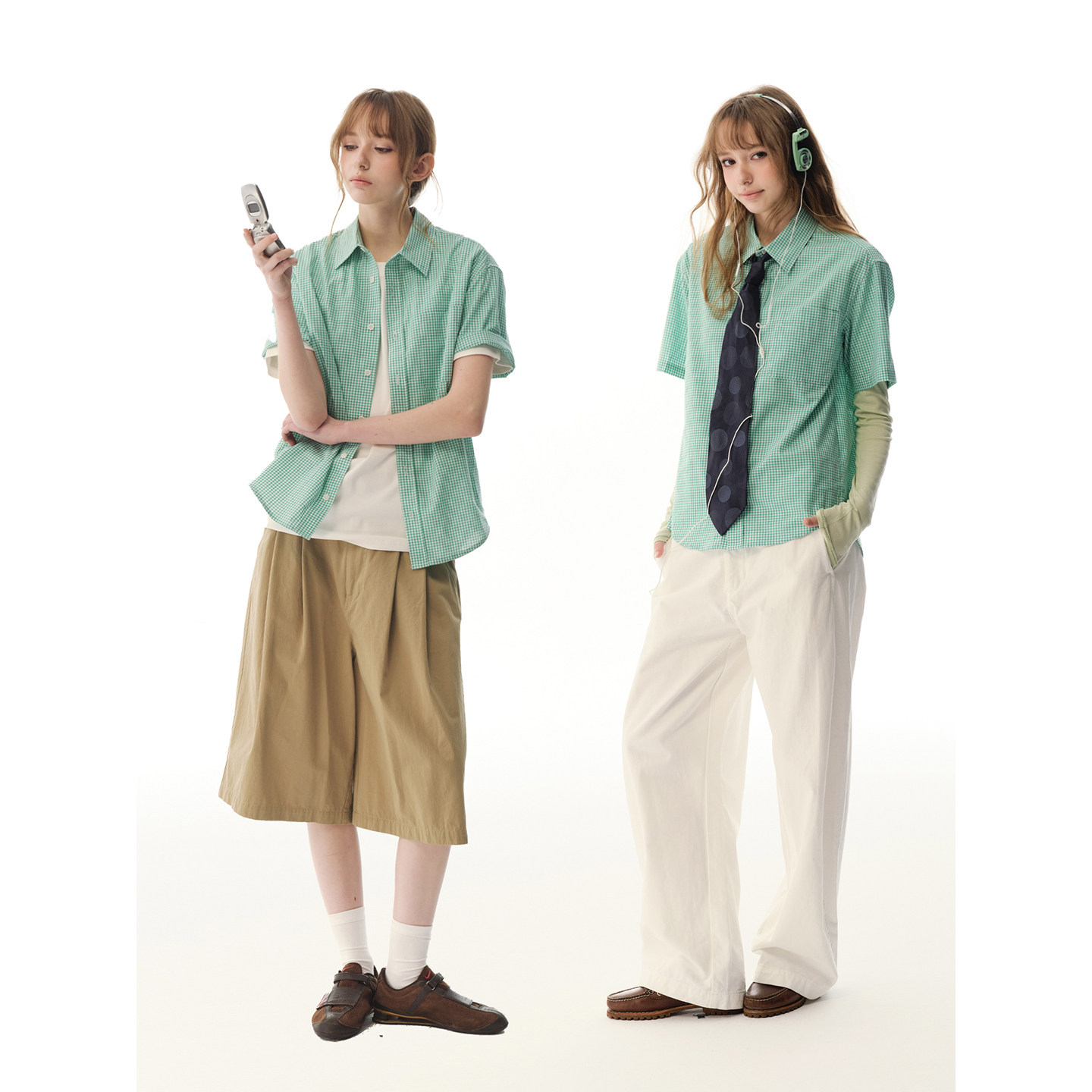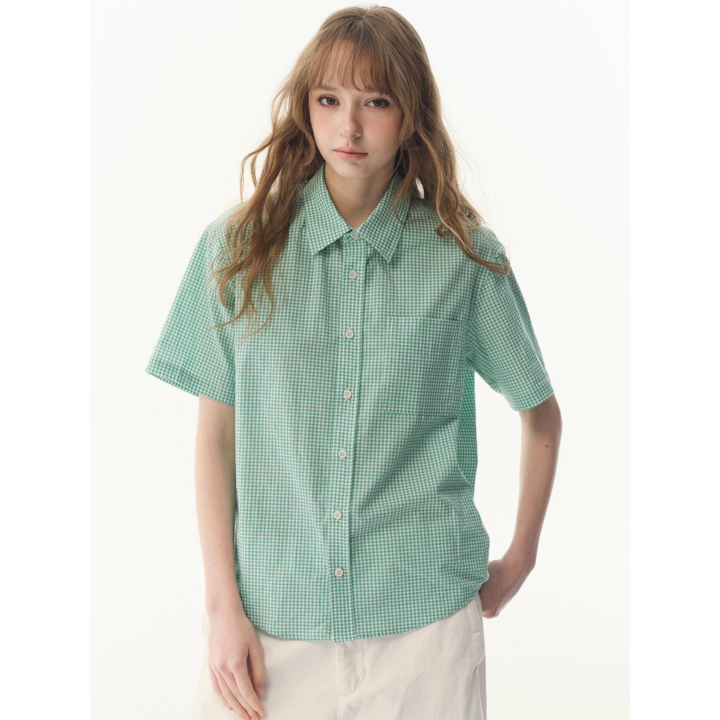 女小个子百搭纯棉显瘦衬衣 衬衫 UNRETRO 夏日清新薄荷绿小格纹短袖