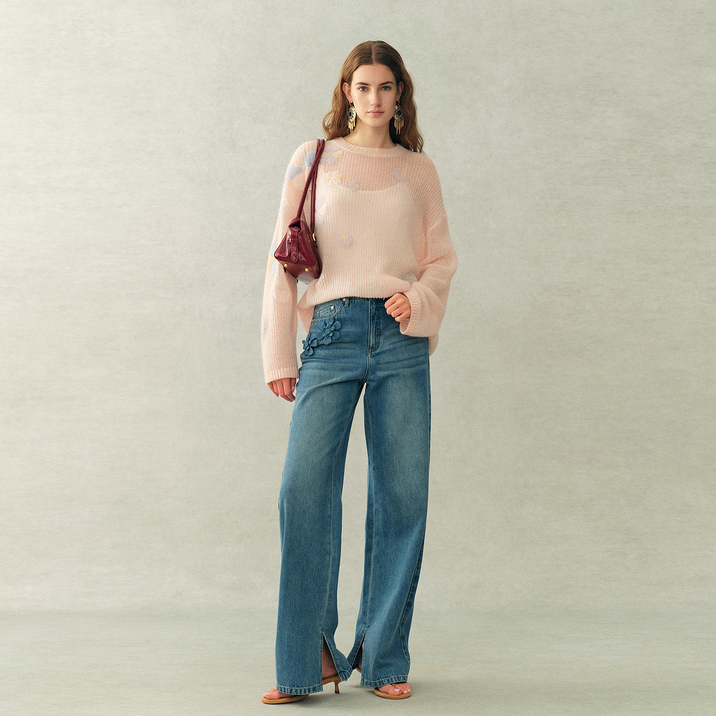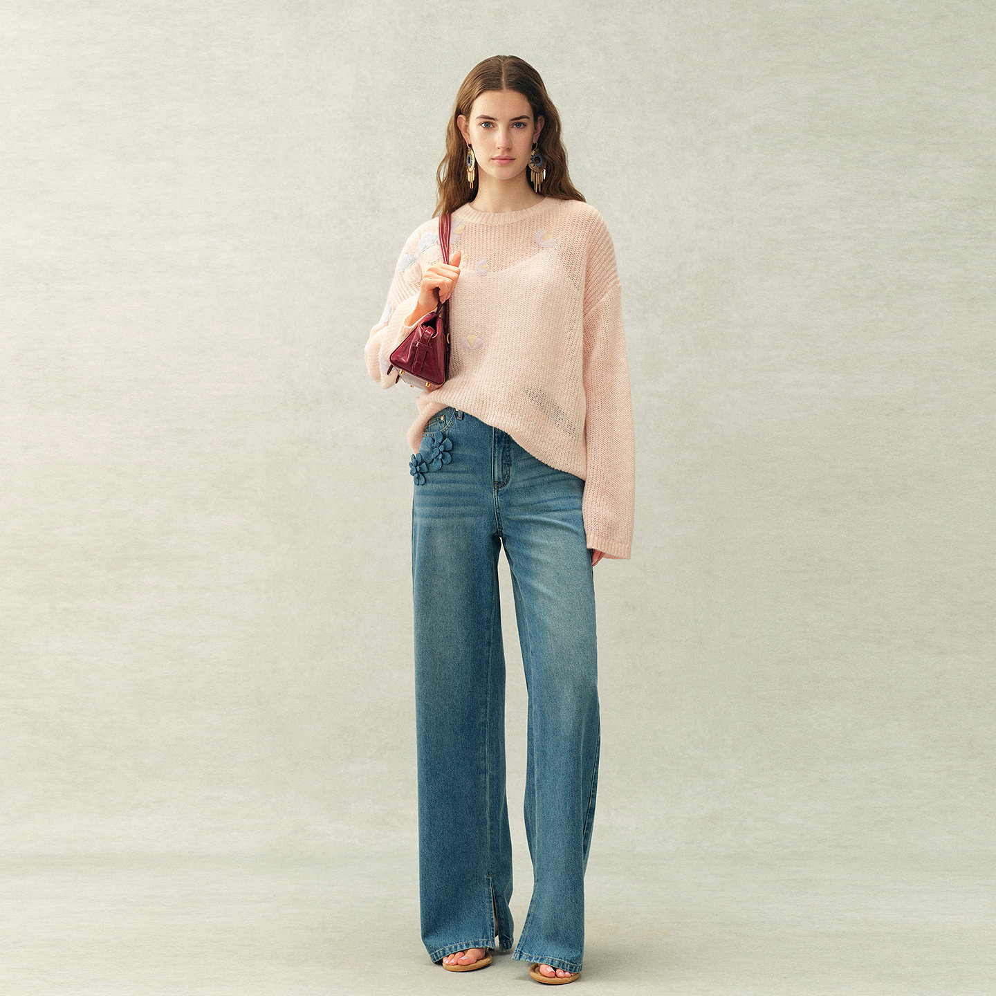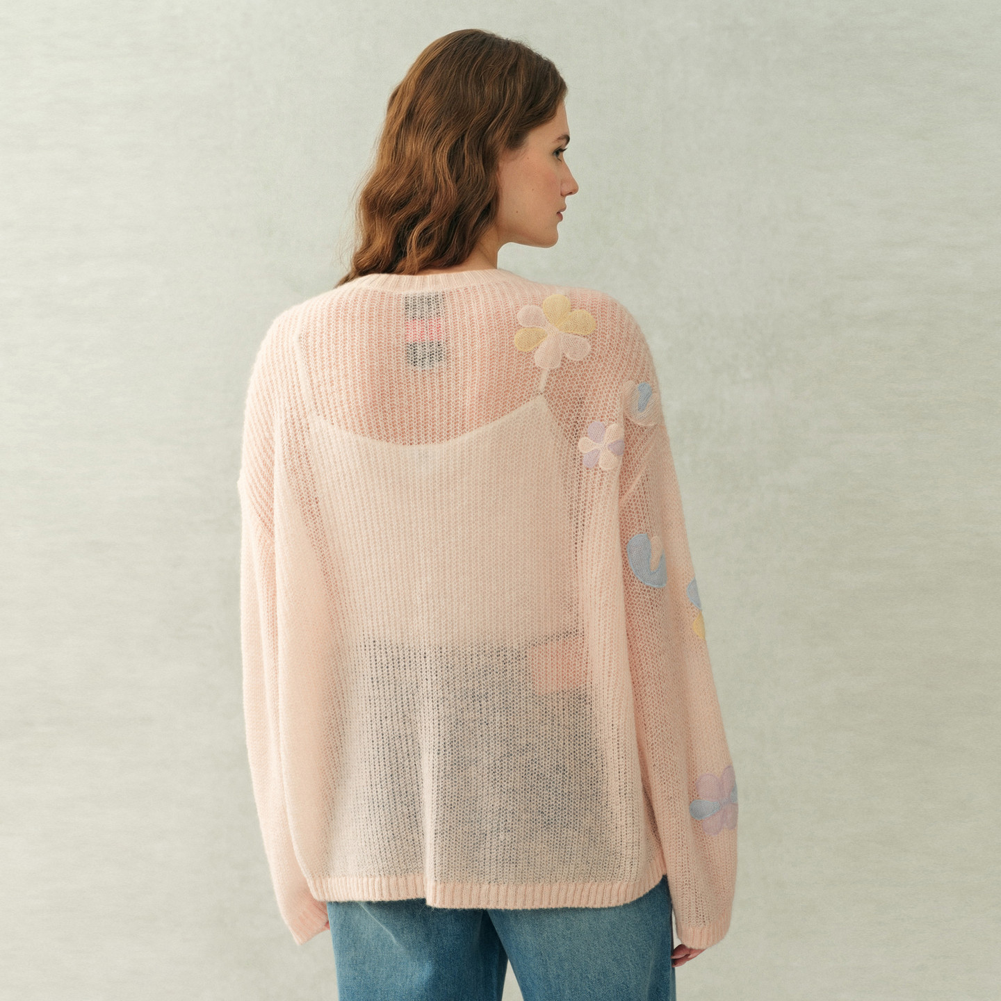 针织毛衣26春新品 Fabrique 柔雾粉绵羊毛马海毛花朵饰片罩衫