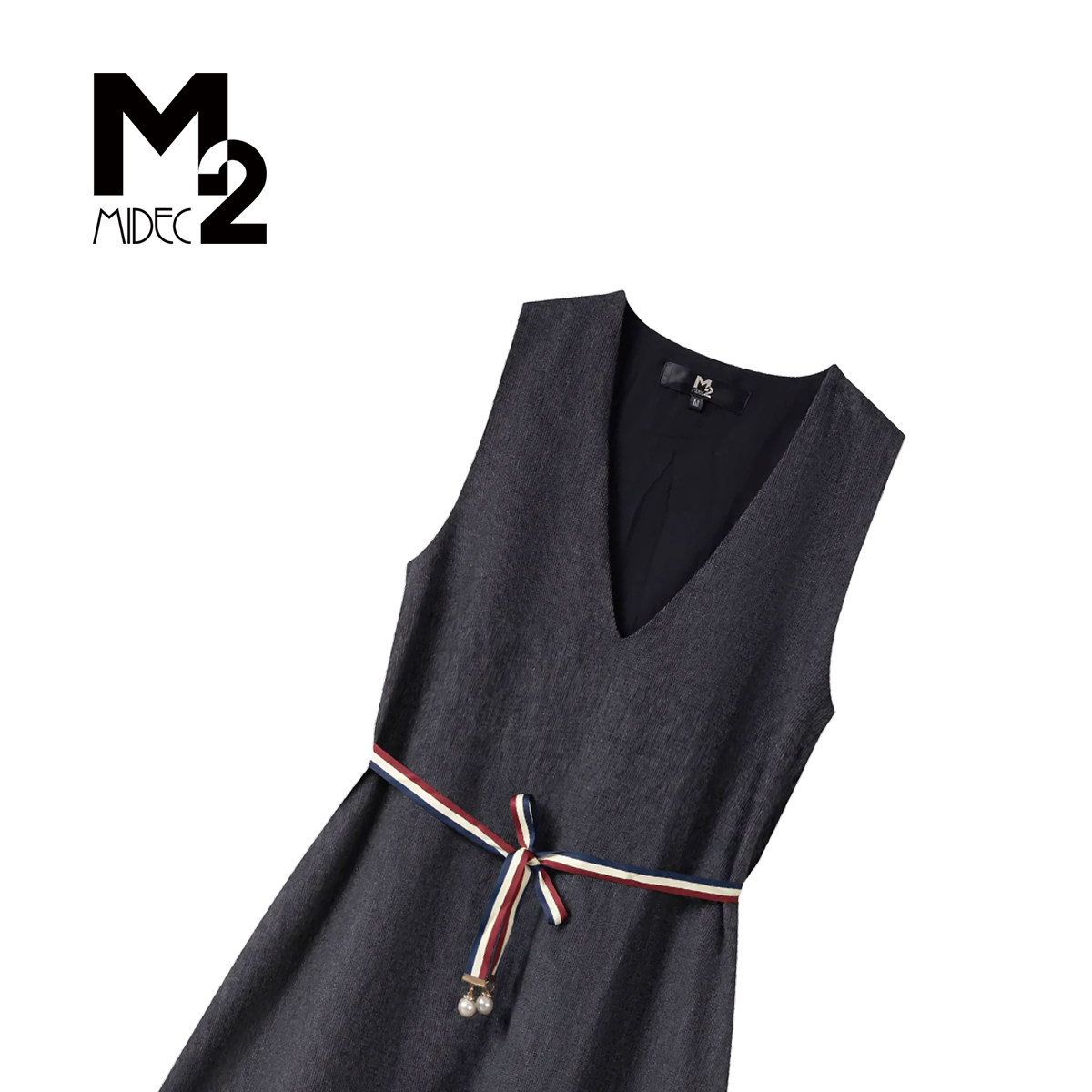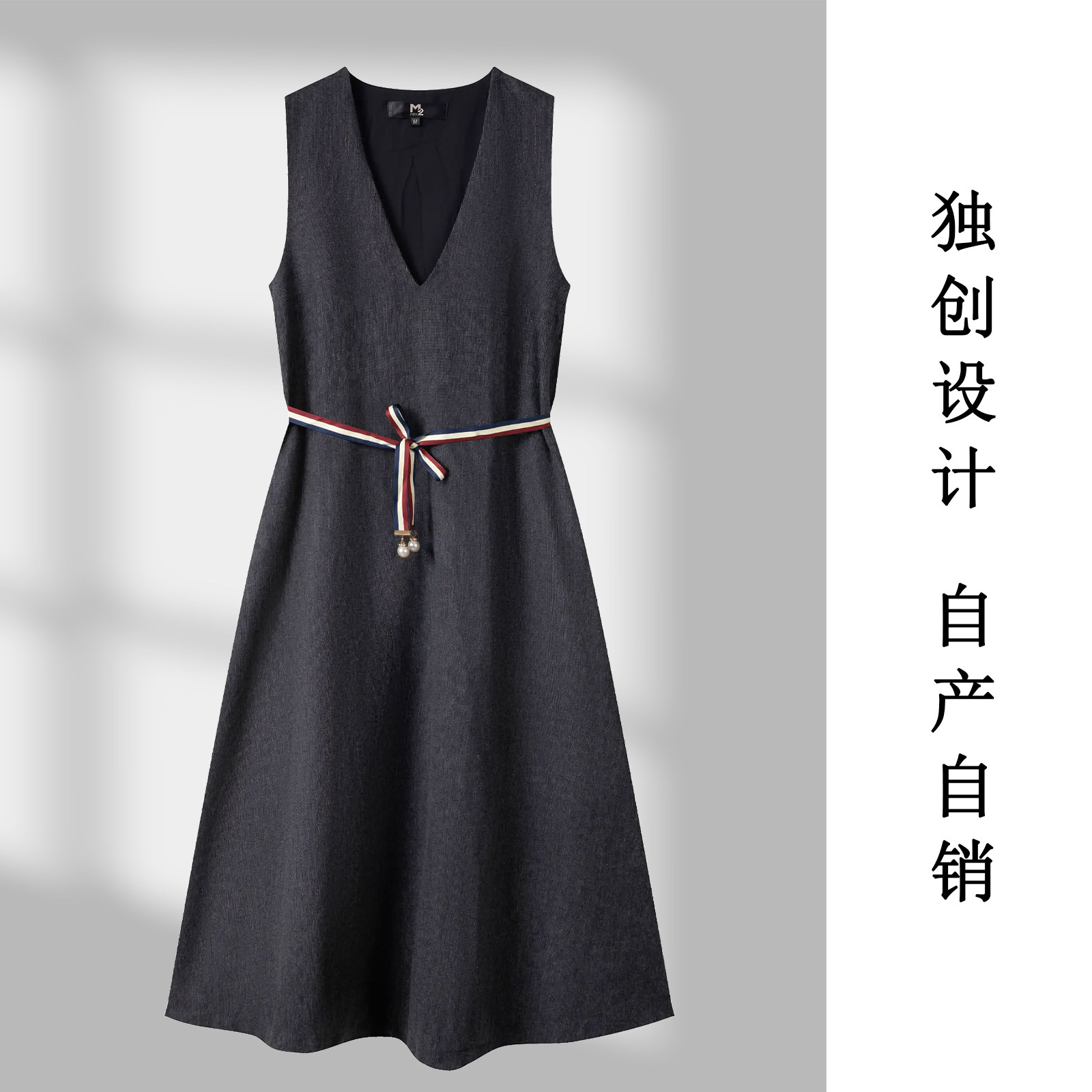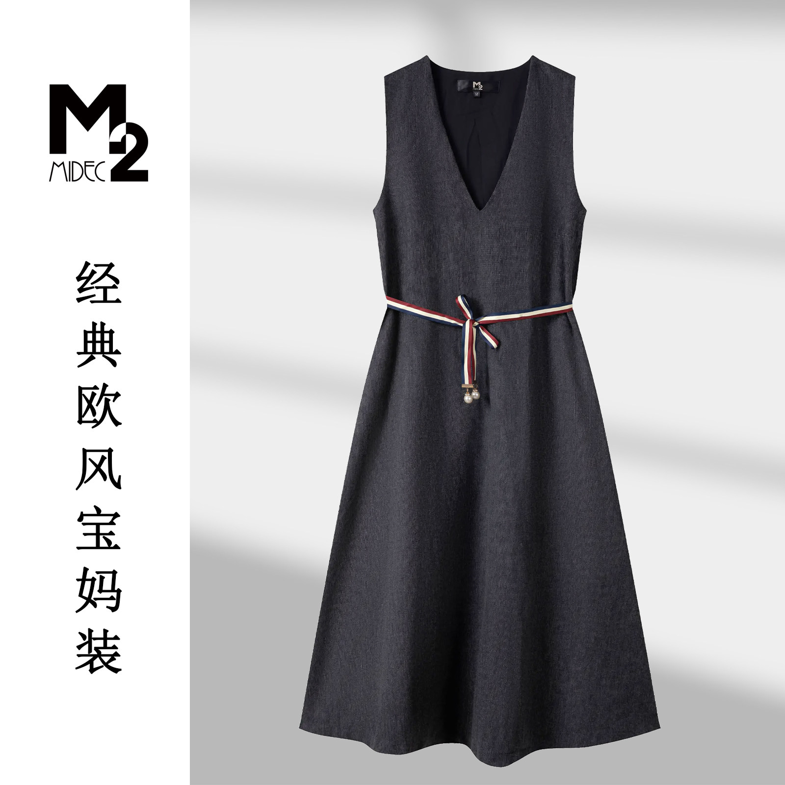 M2折扣店法式 连衣裙女深灰色V领腰带A字裙轻熟优雅风气质长裙 无袖
